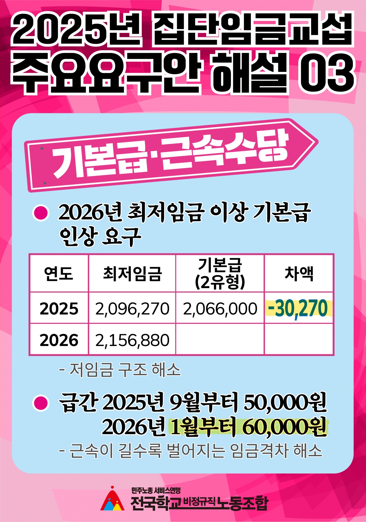 - 2026년 최저시급은 2025년 대비 2.9% 인상된 10,320원으로, 월 환산액(주 40시간 기준)은 2,156,880원임. 현재 2유형 기본급과의 차액은 90,880원임. 학교비정규직 노동자는 여전히 최저임금에도 미치지 못하는 기본급으로, 저임금 문제의 핵심은 기본급임을 명확히 하고 최저임금 이상의 기본급 인상을 요구함.