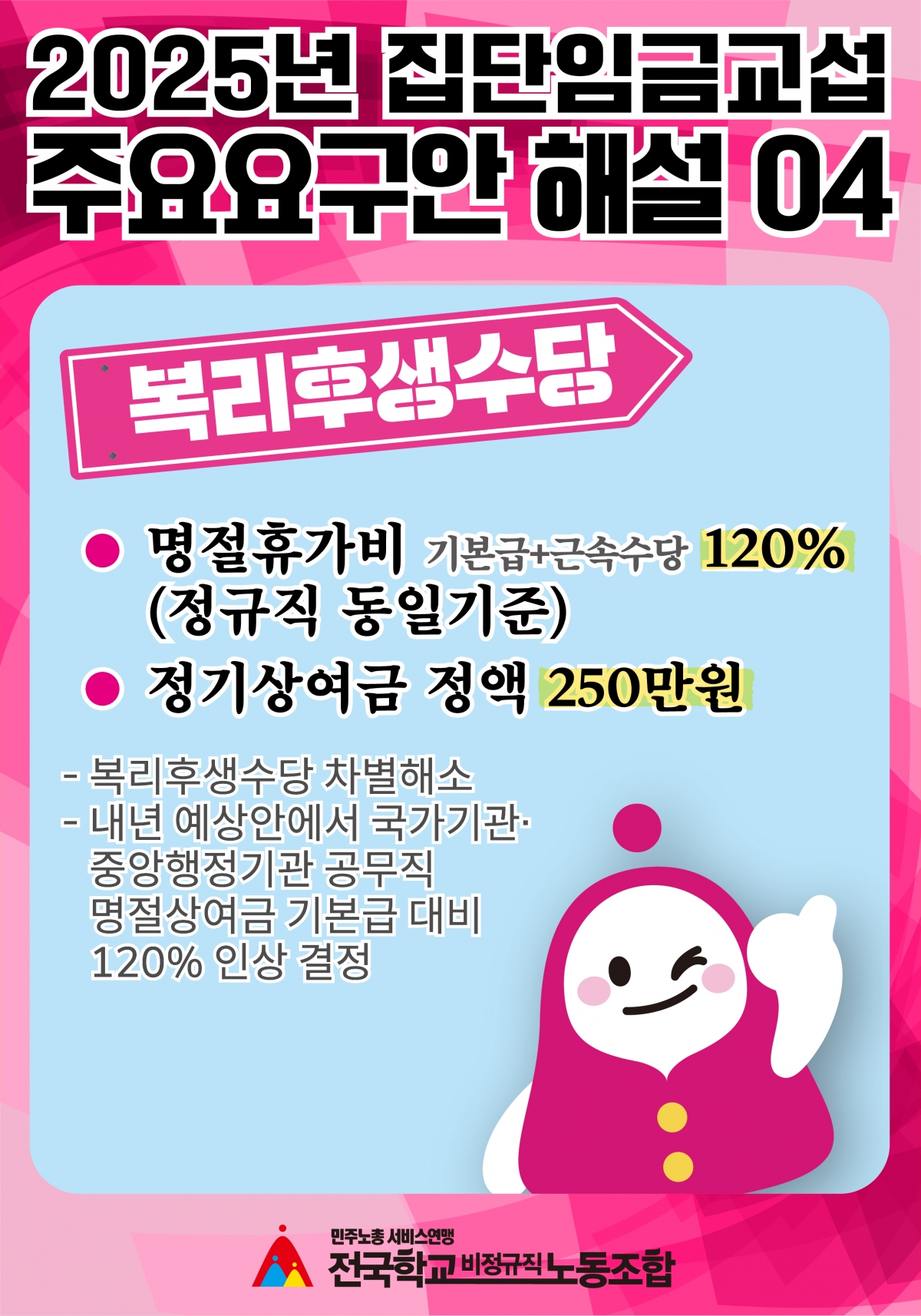 - 방학 중 무임금 대책과 상시직의 직무수당을 함께 요구하며, 비정상적인 임금체계인 방학 중 무임금 문제 해결과 비정규직 임금격차 해소를 촉구함.