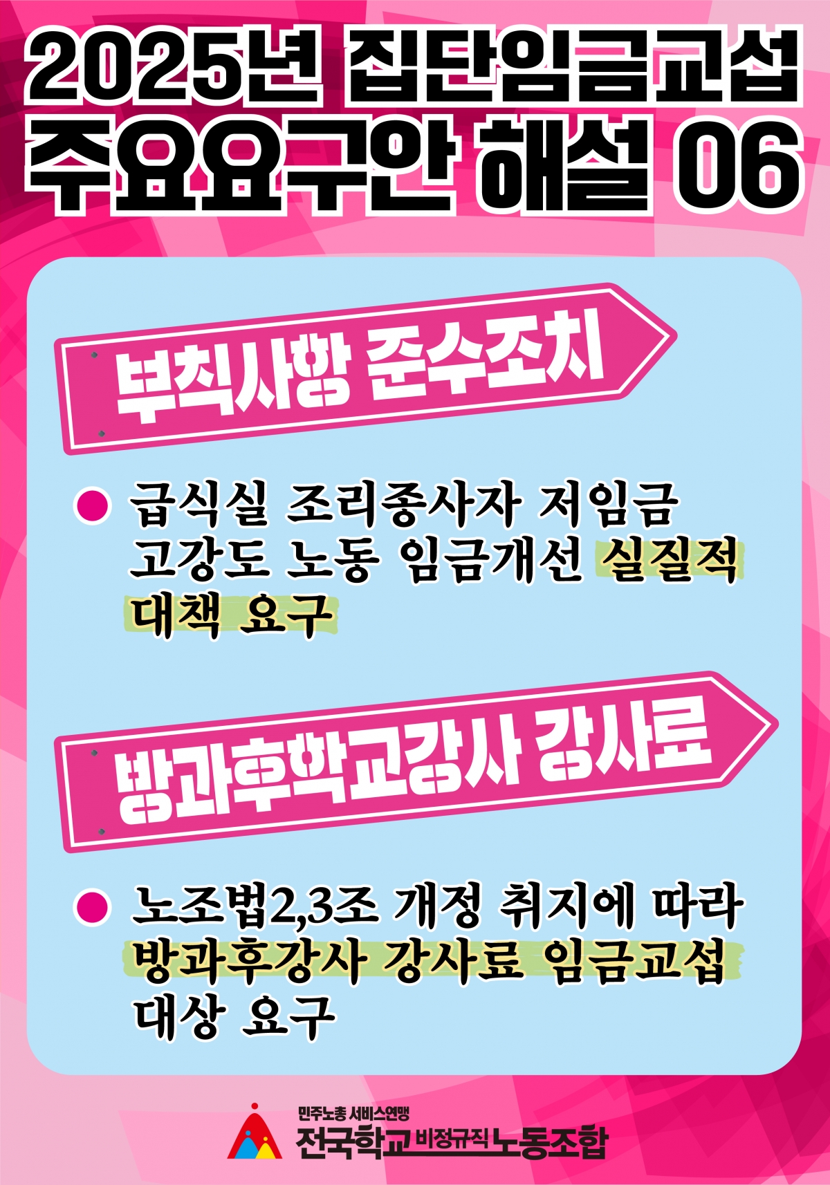 - 23년과 24년에 연달아 급식실 조리종사자에 대한 임금개선 노력을 임금협약서에 명시하였으므로, 올해는 임금개선 대책의 실질적 시행을 요구함.