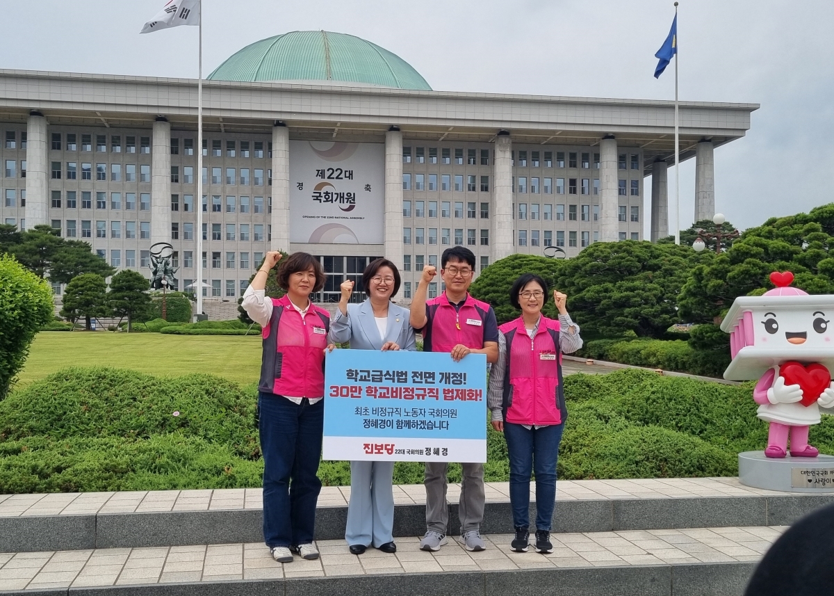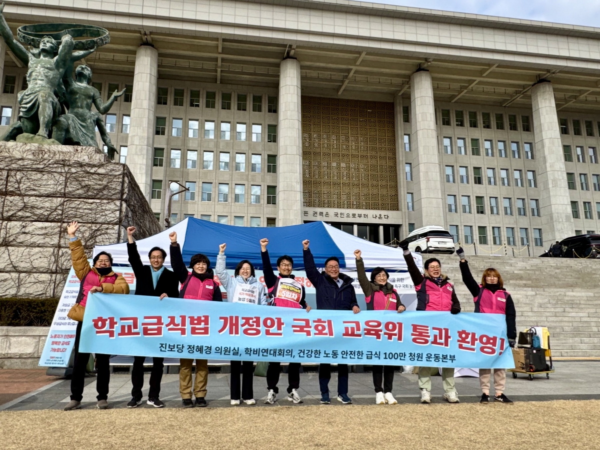 2025년 12월 9일 학교급식법 개정안 국회 교육위 통과_국회안 농성장 앞에서 학비출신 진보당 정혜경국회의원과 함께!