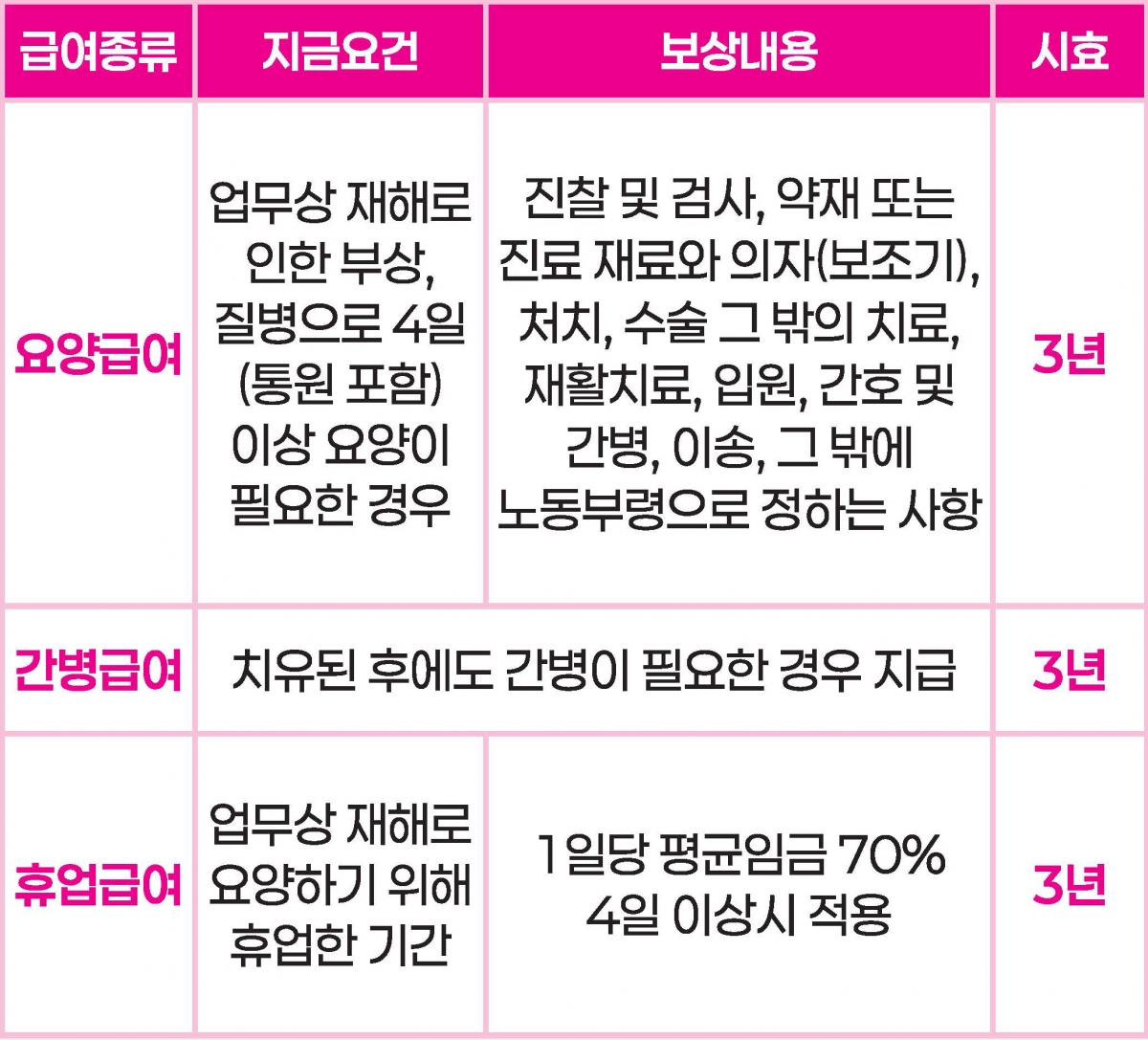 노동자가 일하다 다치거나 질병으로 인한 경우 4일 이상의 요양이 필요할 시 사용자는 요양비, 휴업기간에 대한 휴업보상을 행하여야 할 의무가 있습니다. 이를 보상하기 위하여 모든 사업장에서는 산업재해보상보험에 의무적으로 가입해야 하고 업무상 재해에 대해 산업재해보상보험에 따라 보상을 받을 수 있습니다.