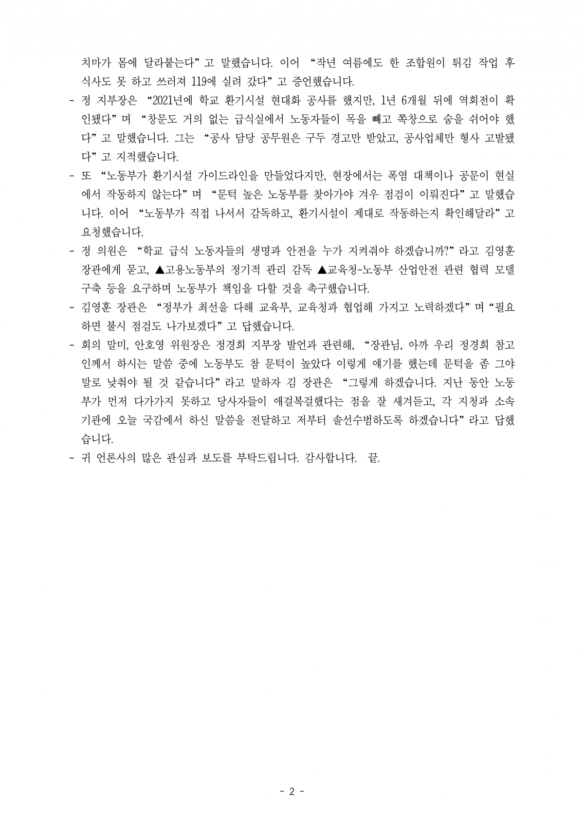 [보도자료] “20kg 밥솥 들고 증언… 학교 급식실은 죽음의 일터” - 10/15 국회 기후에너지환노위 고용노동부 국정감사 관련