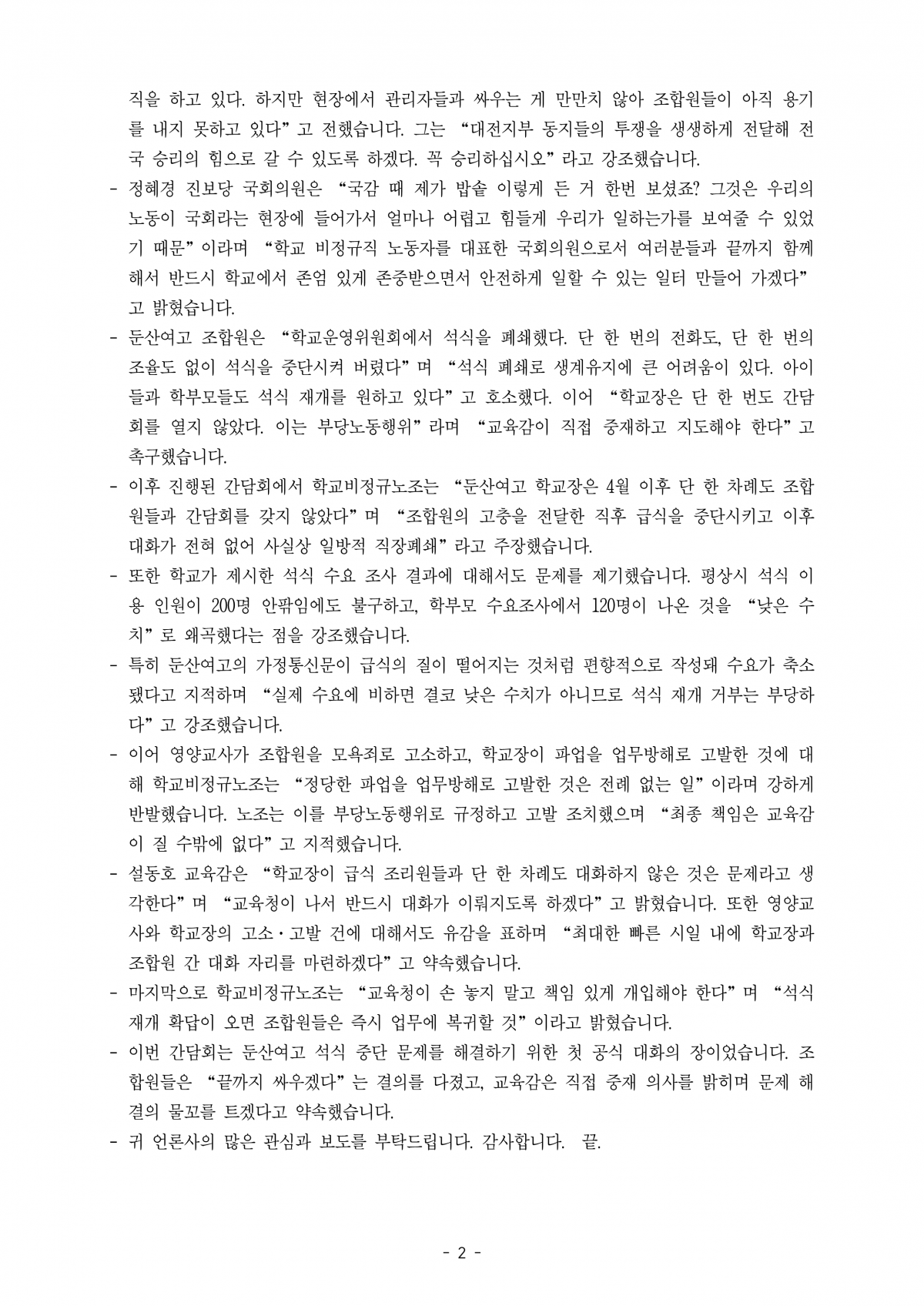 [입장문] “석식 중단, 노조가 아니라 학교장이 멈췄다”(대전지부 파업 투쟁 관련 입장문)