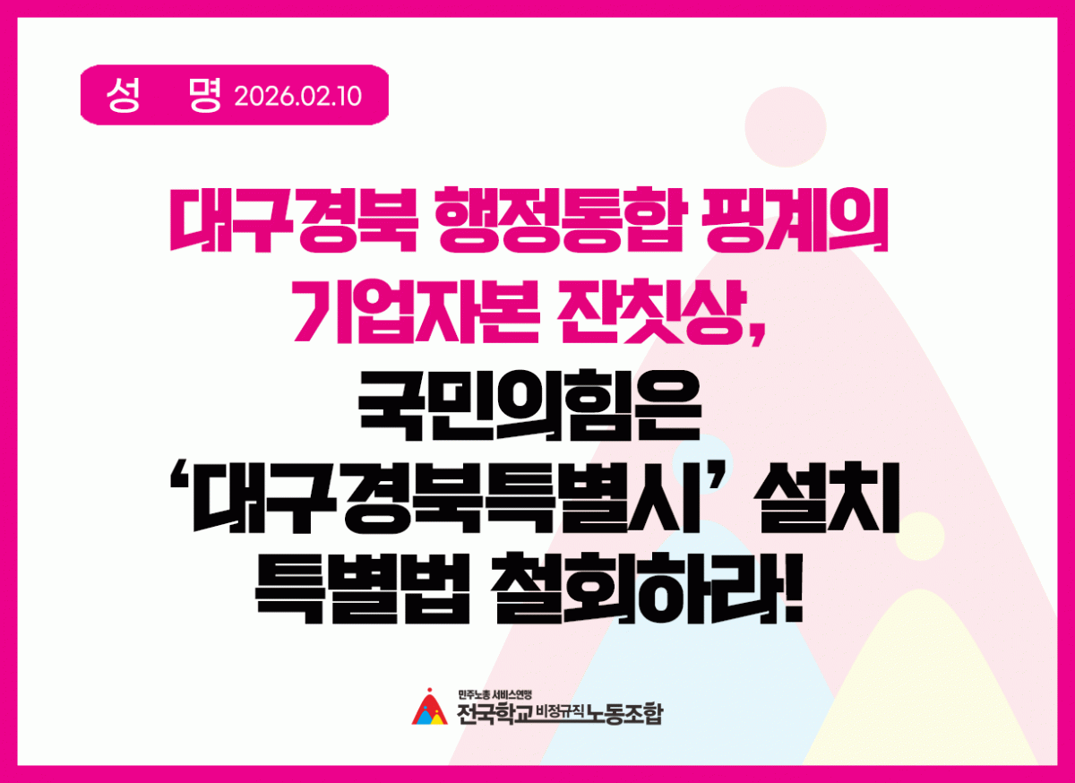 구자근 의원과 국민의힘의 대구경북특별시 설치 특별법안은 ‘글로벌미래특구’의 설치 등으로 거대자본과 기업에 특례를 주는 조항 위주로 구성되어 있다. 이러한 특례조항들은 대구•경북 지역 노동자 민중의 생활 수준을 후퇴시킨다. 게다가, 특별법안의 학교급식법을 무력화시키는 독소조항은 학교 현장의 비정규직 노동자들의 삶을 해치고 교육복지의 가치를 퇴색시킨다. 우리는 노동자 정치의 결실인 근로기준법, 최저임금법, 학교급식법을 무력화하고자 하는 모든 시도를 규탄한다.