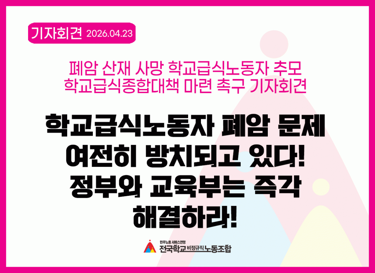 - 전국학교비정규직노동조합(위원장 민태호, 이하 학교비정규직노조)은 오늘 4월 23일(목), 오전 10시 30분 청와대 앞에서 4.28 세계 산재 사망 노동자의 날을 맞아 16명의 폐암 산재 사망 학교급식노동자를 추모하고, 학교급식노동자의 산업재해 예방과 피해자 지원을 위한 정부의 신속한 대책 마련을 촉구하고자 기자회견을 개최했습니다.