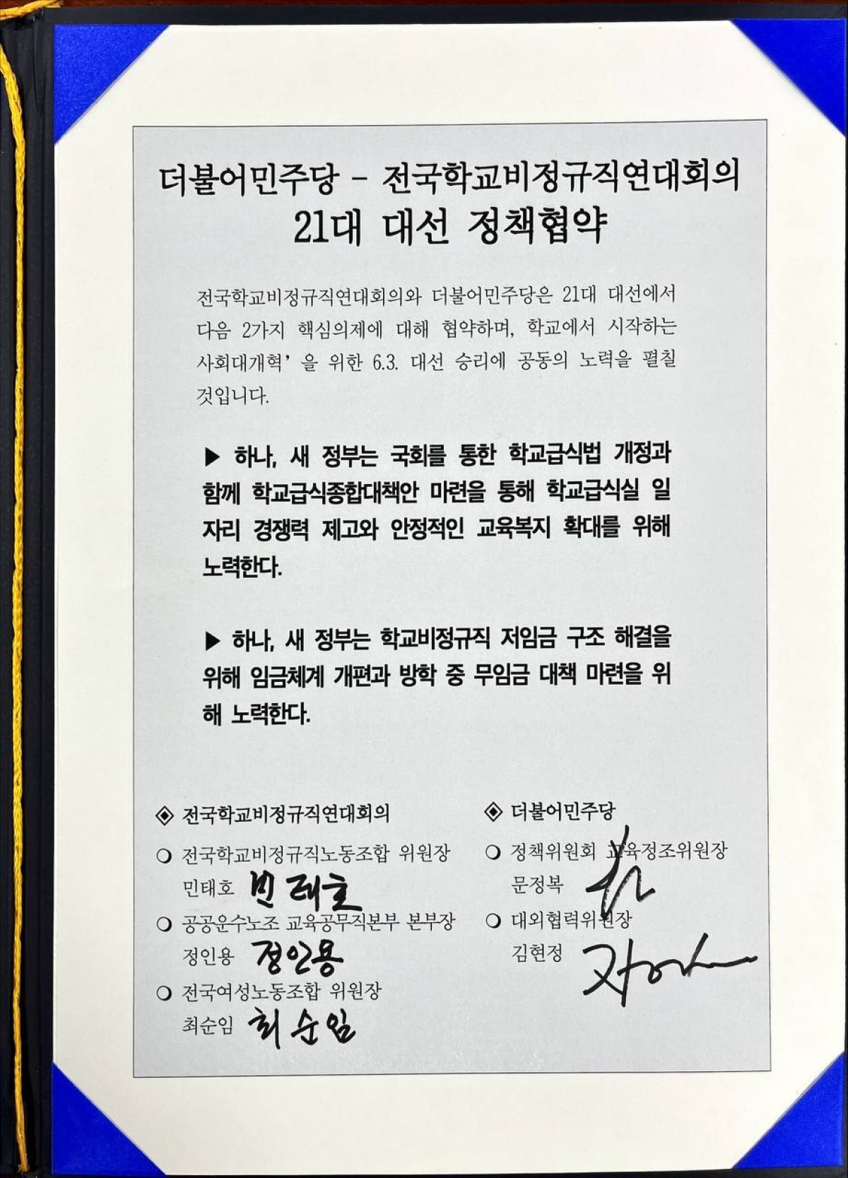 정부서울청사 앞 단식농성 11일차 ‘학교비정규직 처우개선’, ‘학교급식 종합대책 마련’ 정책협약 체결 전국학교비정규직노동조합 등 전국학교비정규직연대회의는 오늘(1일) 더불어민주당과 21대 대선 정책 협약식을 열고 한국사회의 뿌리 깊은 불평등과 저임금 비정규직 노동의 차별을 끝장내고, 우리 아이들을 위한 무상급식 지속을 위해 학교급식 위기 해결 등의 내용을 담아 정책협약을 진행하였다.