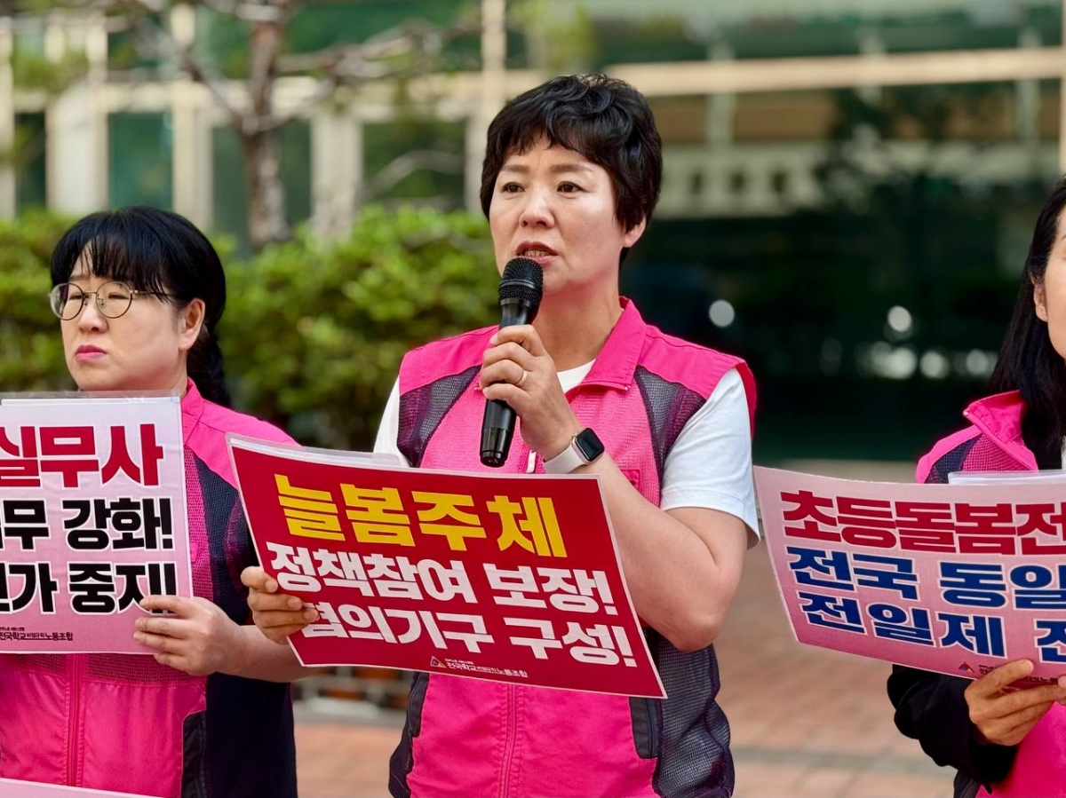 전국학교비정규직노동조합 서울지부 김지인 돌봄전담사 분과장은 돌봄은 아무나 할 수 있는 일이 아니라 돌봄 전문가의 손으로 돌봄 전문공간에서 이루어져야 한다.”라며 학교 안 돌봄 정책의 구체적 로드맵을 요구했다.