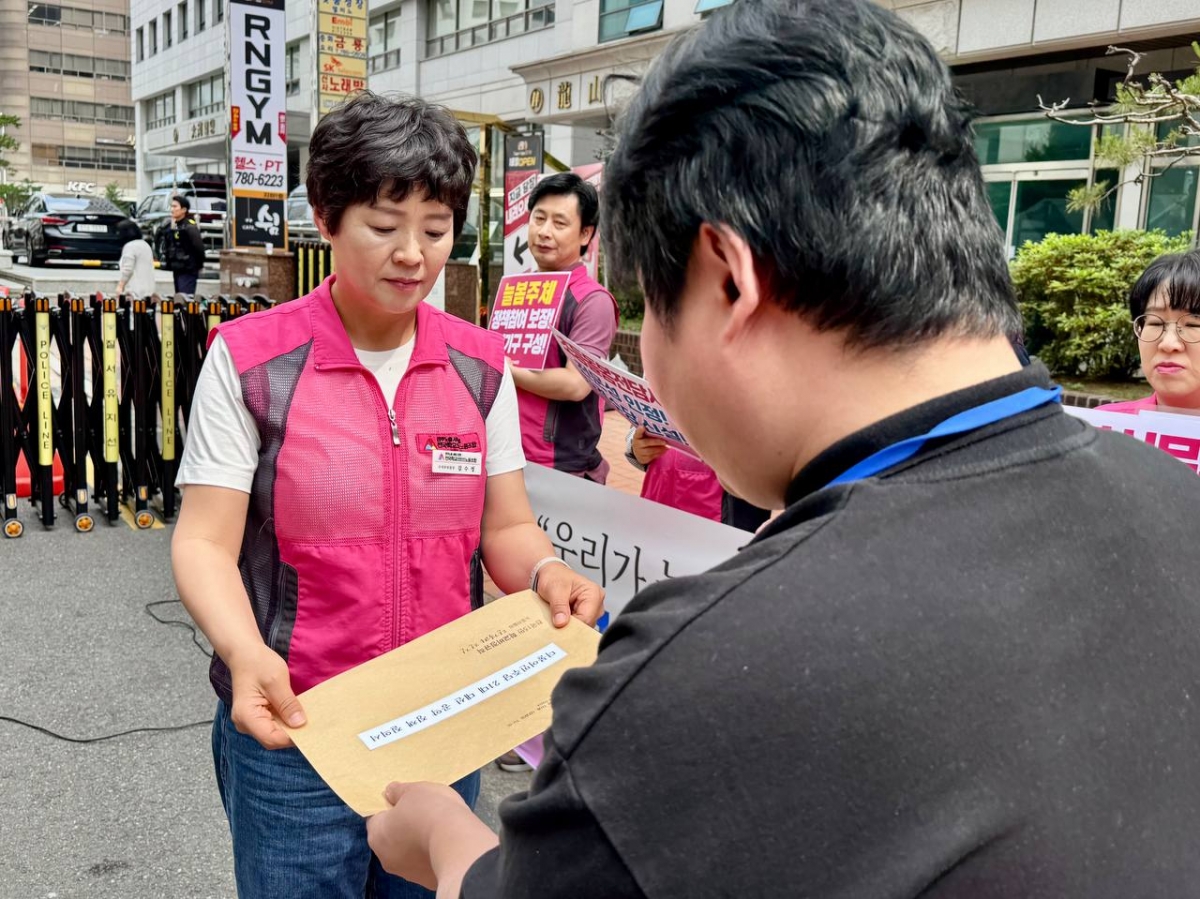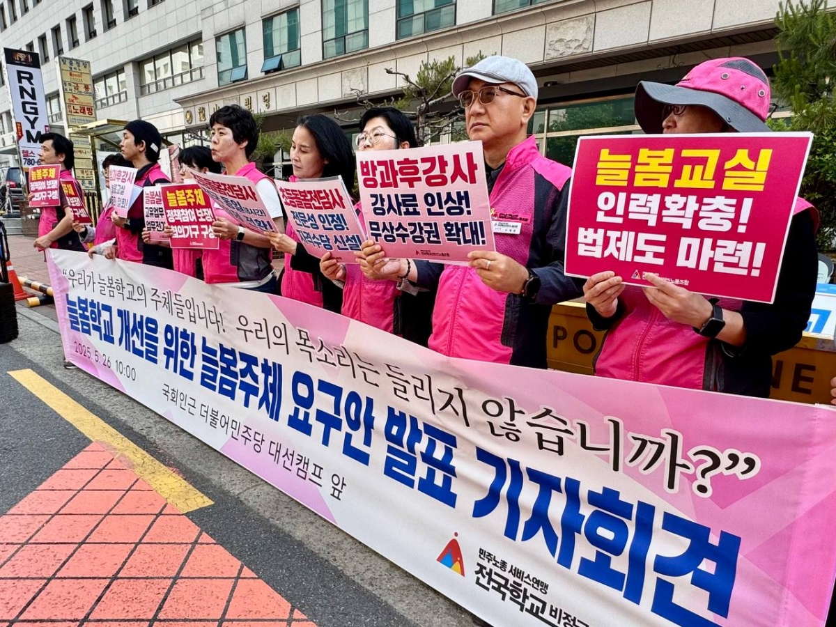 전국학교비정규직노동조합은 어제(26) 서울 여의도 국회 인근 민주당 선대위 앞에서 늘봄학교 개선을 위한 늘봄주체 요구안 발표 기자회견을 열었다.