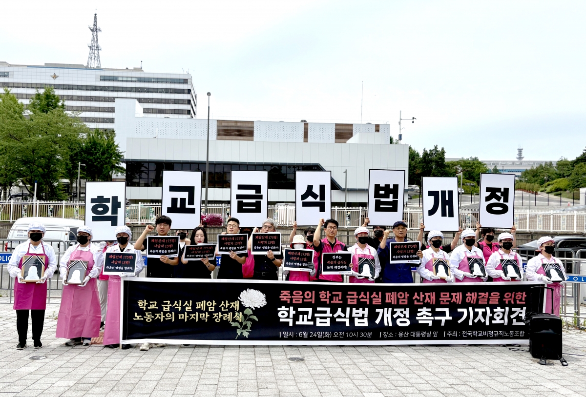 전국학교비정규직노동조합은 어제(24) 서울 용산 대통령실 앞에서 죽음의 학교 급식실 폐암 산재 문제 해결을 위한 학교급식법 개정 촉구 기자회견을 진행했다.