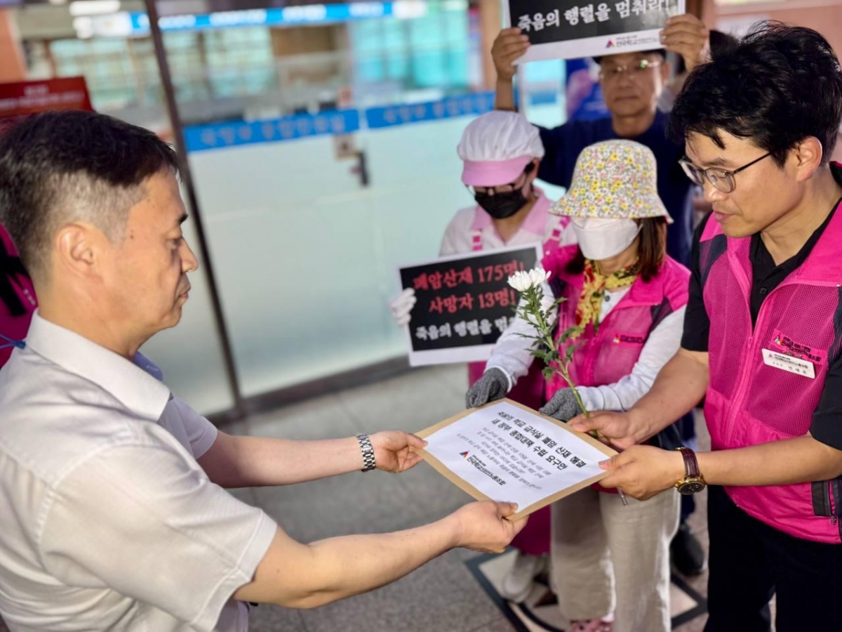 전국학교비정규직노동조합은 학교급식노동자와 함께 죽음의 학교 급식실 폐암 산재 문제 해결을 위한 학교급식법 개정 요구안을 대통실에 전달했다.