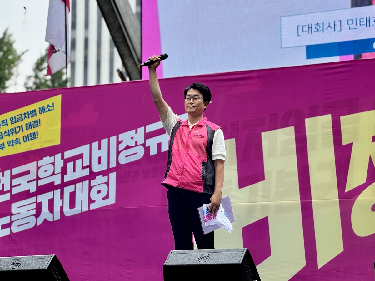 학비노조 민태호 위원장은 대회사를 통해“11일간의 단식투쟁으로 새 정부가 저임금구조 개선과 방학 중 무임금 문제 해결, 학교급식 종합대책 마련을 약속했다”라며, “그 열매를 직접 우리 손으로 쟁취하고 세상을 바꾸는 투쟁으로 나아가자!”라고 외쳤다.