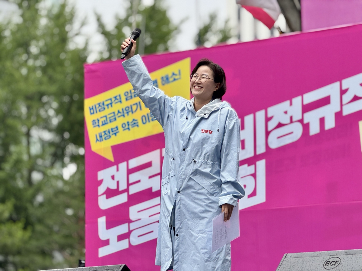 진보당 정혜경 국회의원은 “학교비정규직노동자가 외쳐 온 차별 없는 세상을 현실로 만들 때”라며 “임금체계 개편과 학교급식법 개정을 시작으로, 학교비정규직 국회의원인 제가 앞장서겠다”라고 강조했다.