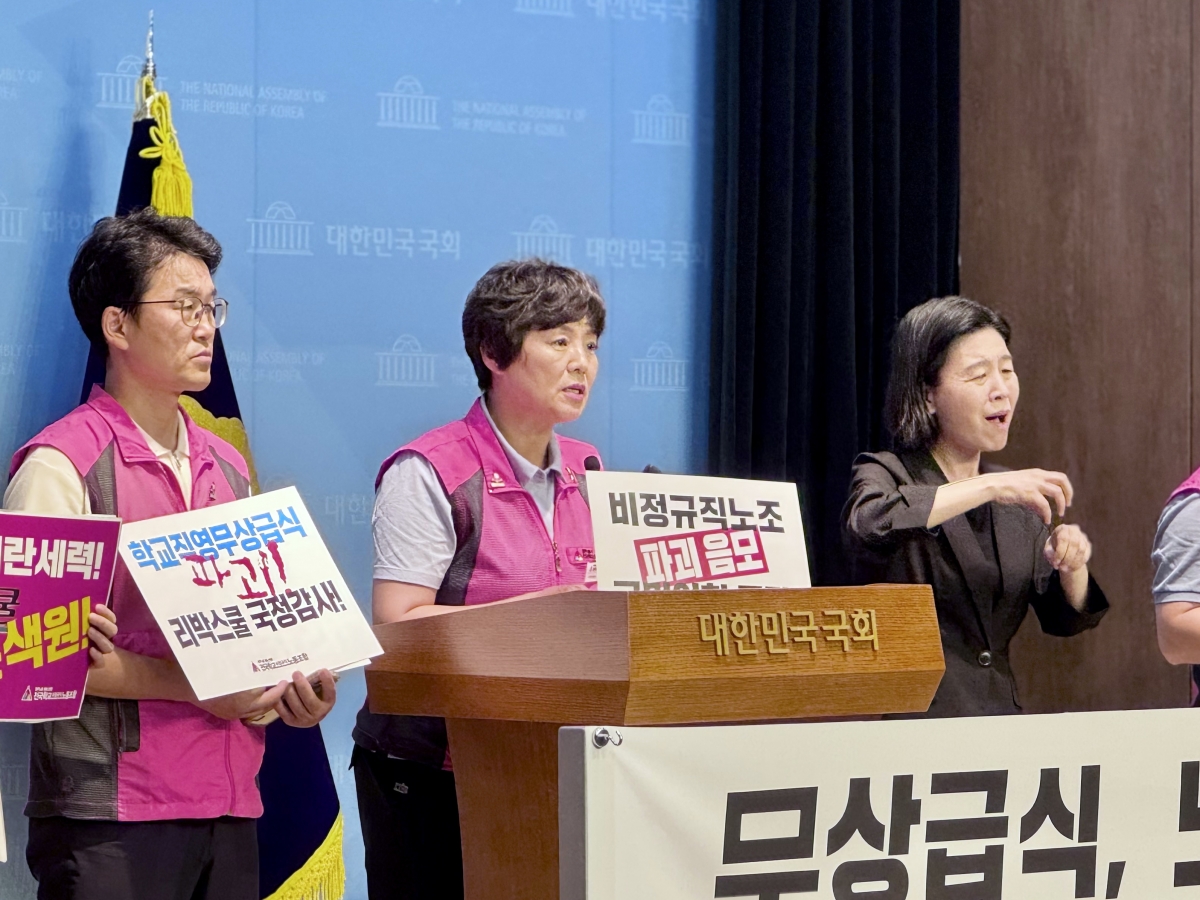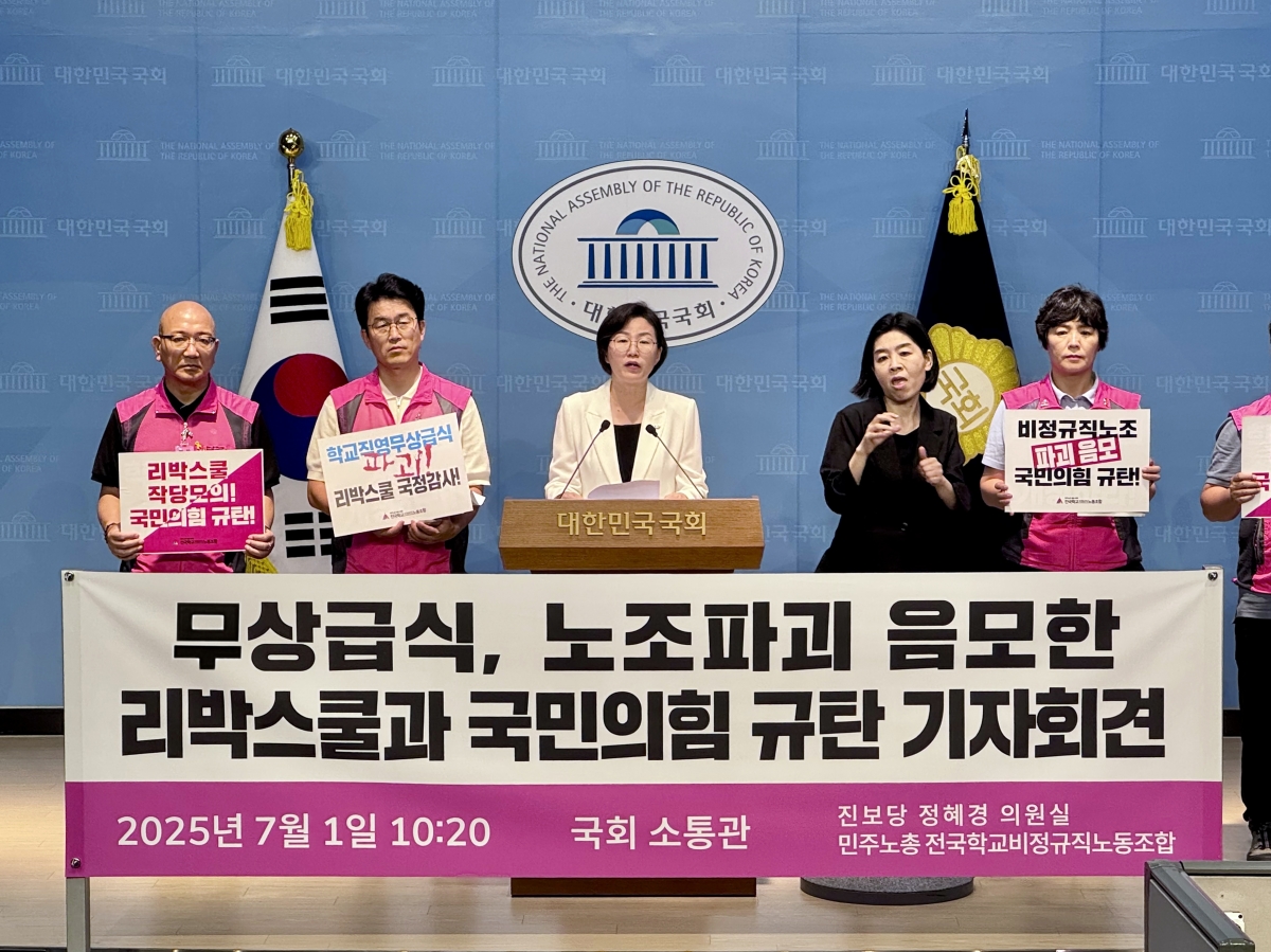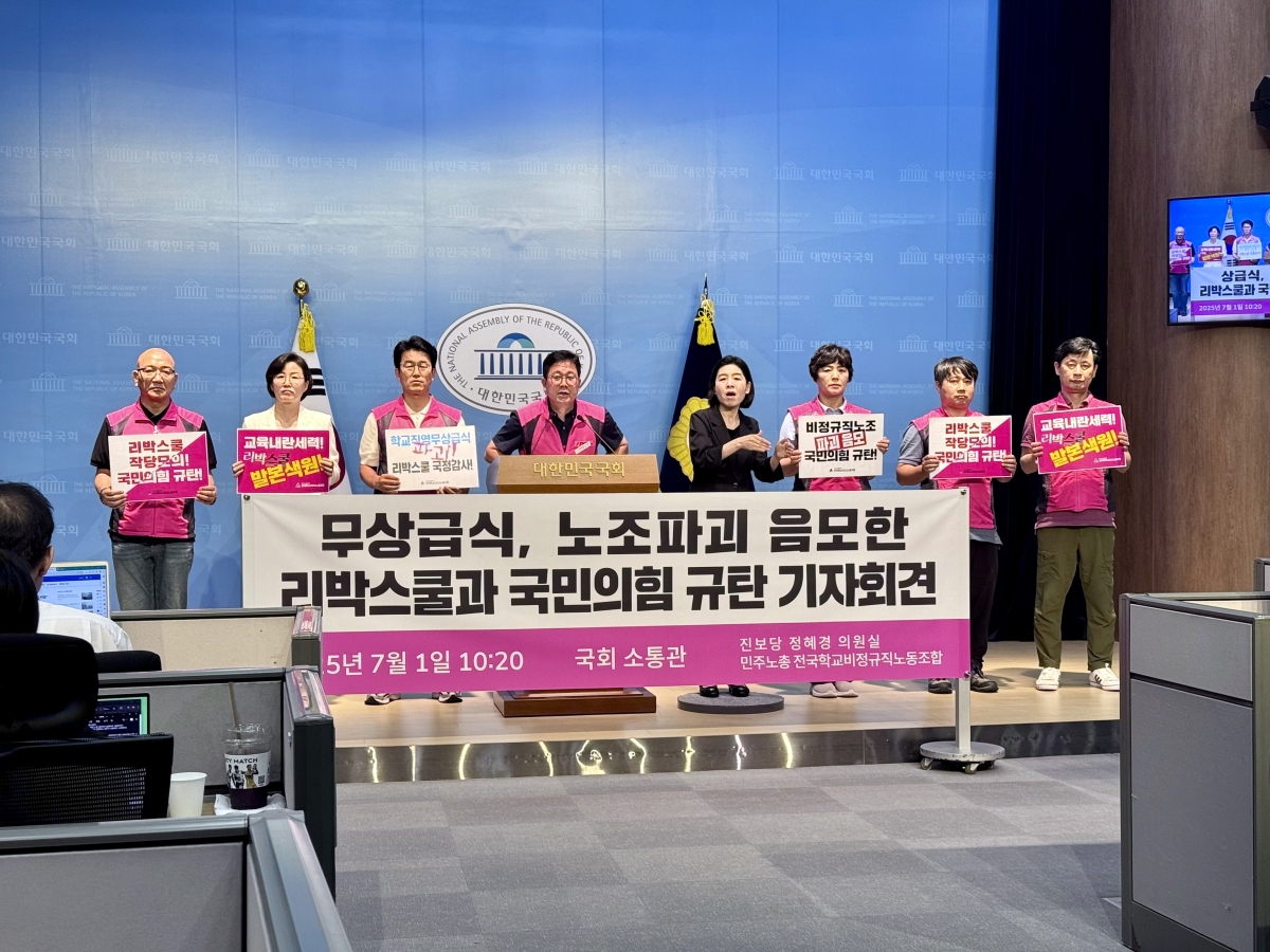 전국학교비정규직노동조합은 지난 1일 국회 소통관과 전국 국민의힘 지방당사 앞에서 무상급식과 노조 파괴를 음모한 리박스쿨과 국민의힘을 규탄하는 동시다발 기자회견을 진행했다.