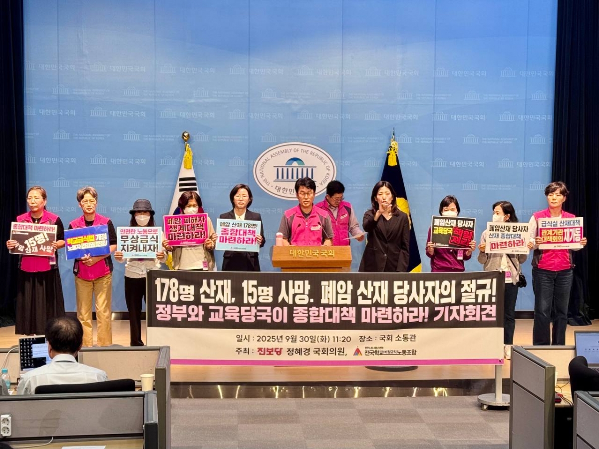 전국학교비정규직노동조합(학비노조)은 지난 9월 30일 국회 소통관에서 폐암산재 당사자들이 직접 발언자로 나선 기자회견을 진행하고, 정혜경 국회의원과 폐암 산재 당사자자들과 간담회를 진행하였다.