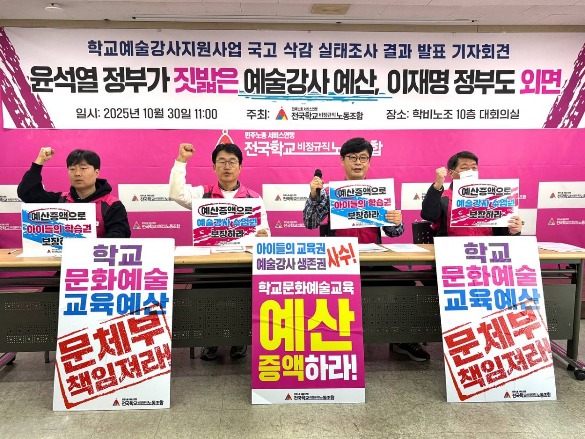 전국학교비정규직노동조합은 오늘(30) 11시 학비노조 10층 대회의실에서 윤석열 정부가 짓밟은 예술강사 예산, 이재명 정부도 외면학교예술강사지원사업 국고 삭감 실태조사 결과 발표 기자회견을 진행했다.