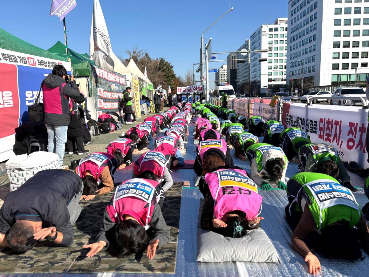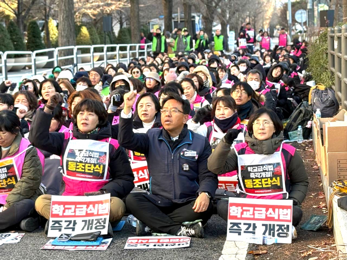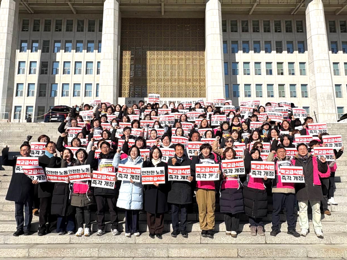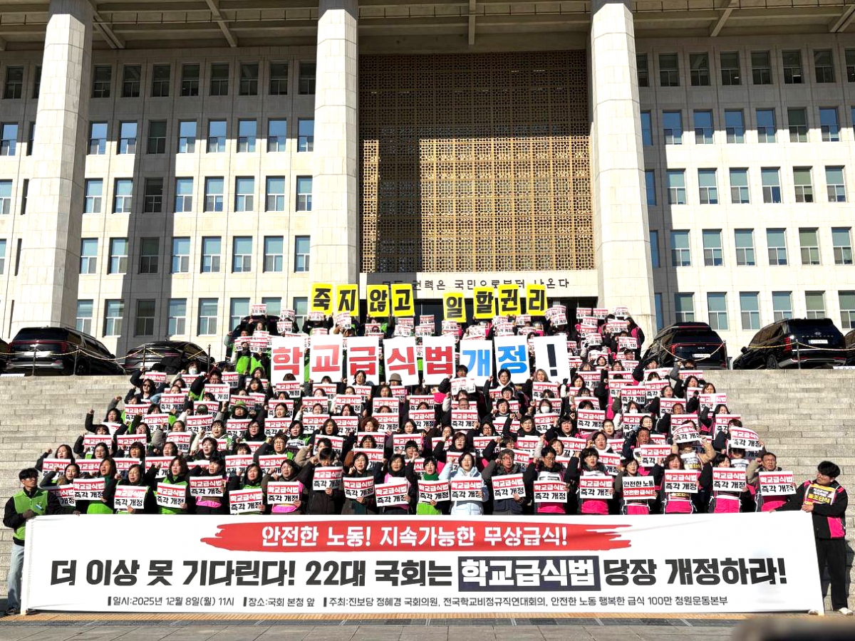 전국학교비정규직노동조합 등 전국학교비정규직연대회의는 지난 8일 국회 본관 계단에서 “22대 국회 학교급식법 즉각 개정 촉구 국회 기자회견”을 시작으로 법안 통과를 위한 집중투쟁에 돌입했다. 4일 간 이어진 릴레이 총파업의 핵심 요구 중 하나는 학교급식노동위기 해결을 위한 학교급식법 개정안 통과다. 지난 8일, 국회 교육위원회 법안소위 학교급식법 개정안 심의를 앞두고 학비연대회의는 대규모 기자회견과 개정 촉구를 위한 108배. 300여명의 동조 단식단, 선전전, 결의대회까지 진행하며 전면 투쟁에 나섰다.