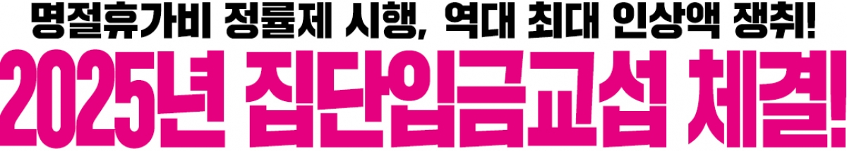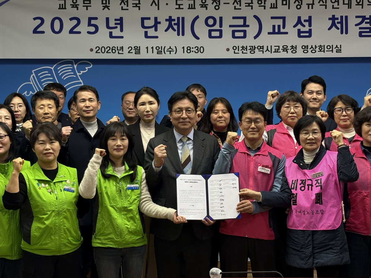 전국학교비정규직노동조합 등 학교비정규직연대회의는 오늘(11일) 인천시교육청에서 2025년 집단임금교섭 체결식을 진행하였다. 조합원들과 함께한 투쟁과 지난한 교섭의 결과로 지난 8일 잠정합의 후 조합원 찬반투표를 통해 99%의 압도적 찬성으로 승인되었다.