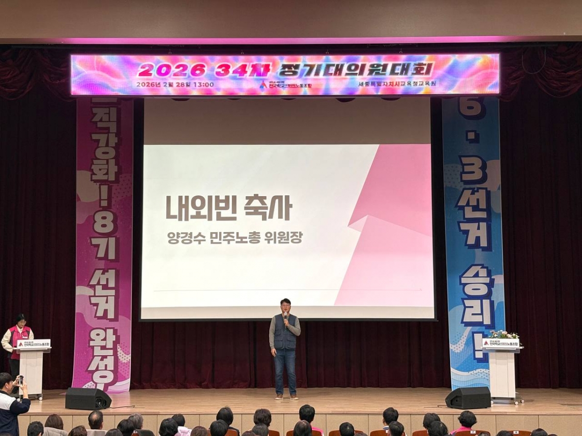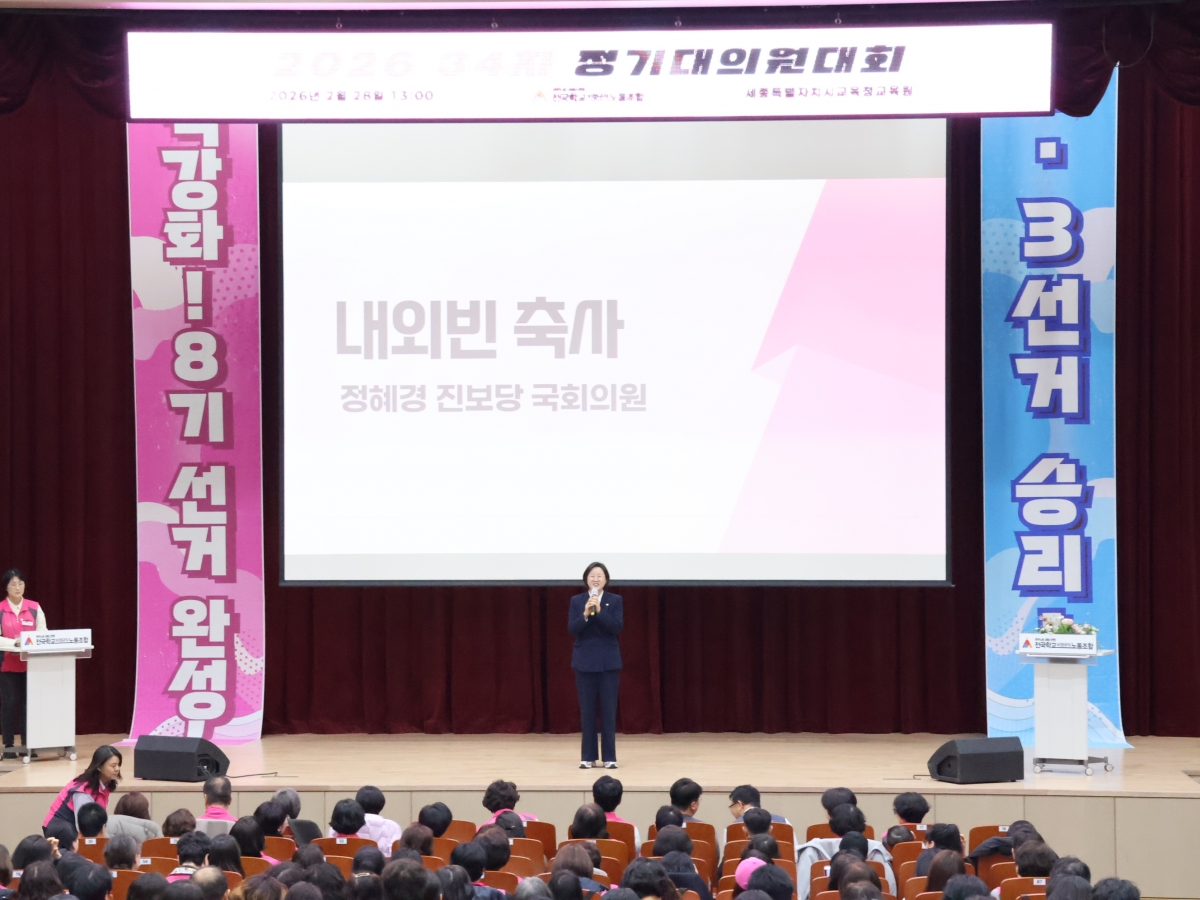 전국학교비정규직노동조합(학교비정규직노조)은 지난 2월 28일 세종 교육청 교육원 대강당에서 34차 정기대의원대회를 열고 2025년 사업평가와 2026년 사업계획 등을 논의하고 결정하였다. 이번 대의원대회에는 양경수 민주노총 위원장, 김광창 서비스연맹 위원장, 정혜경 진보당 국회의원 등이 함께 자리해 주었다. 김재연 진보당 상임대표는 영상으로 인사말을 전했다.