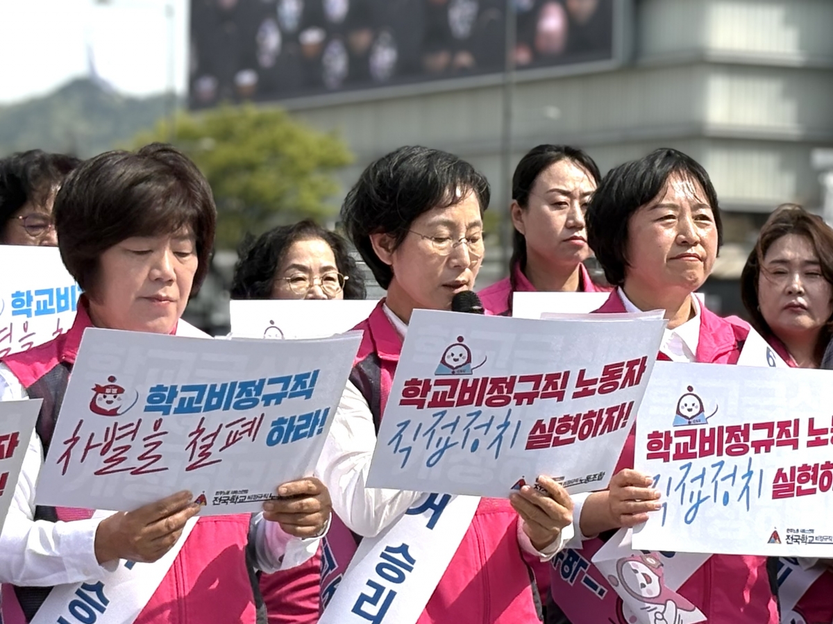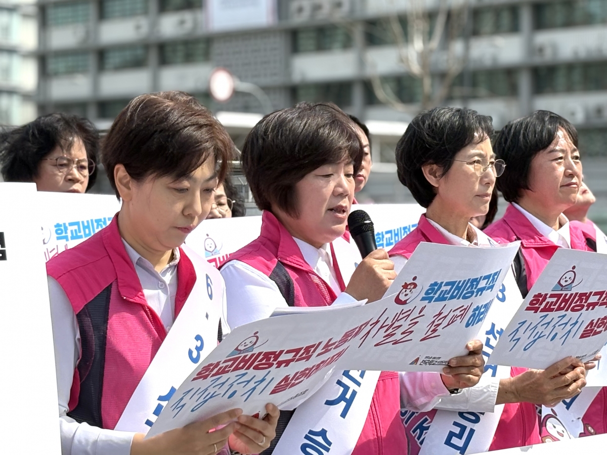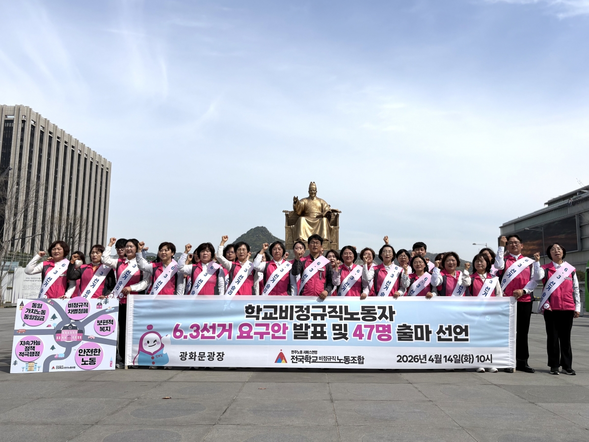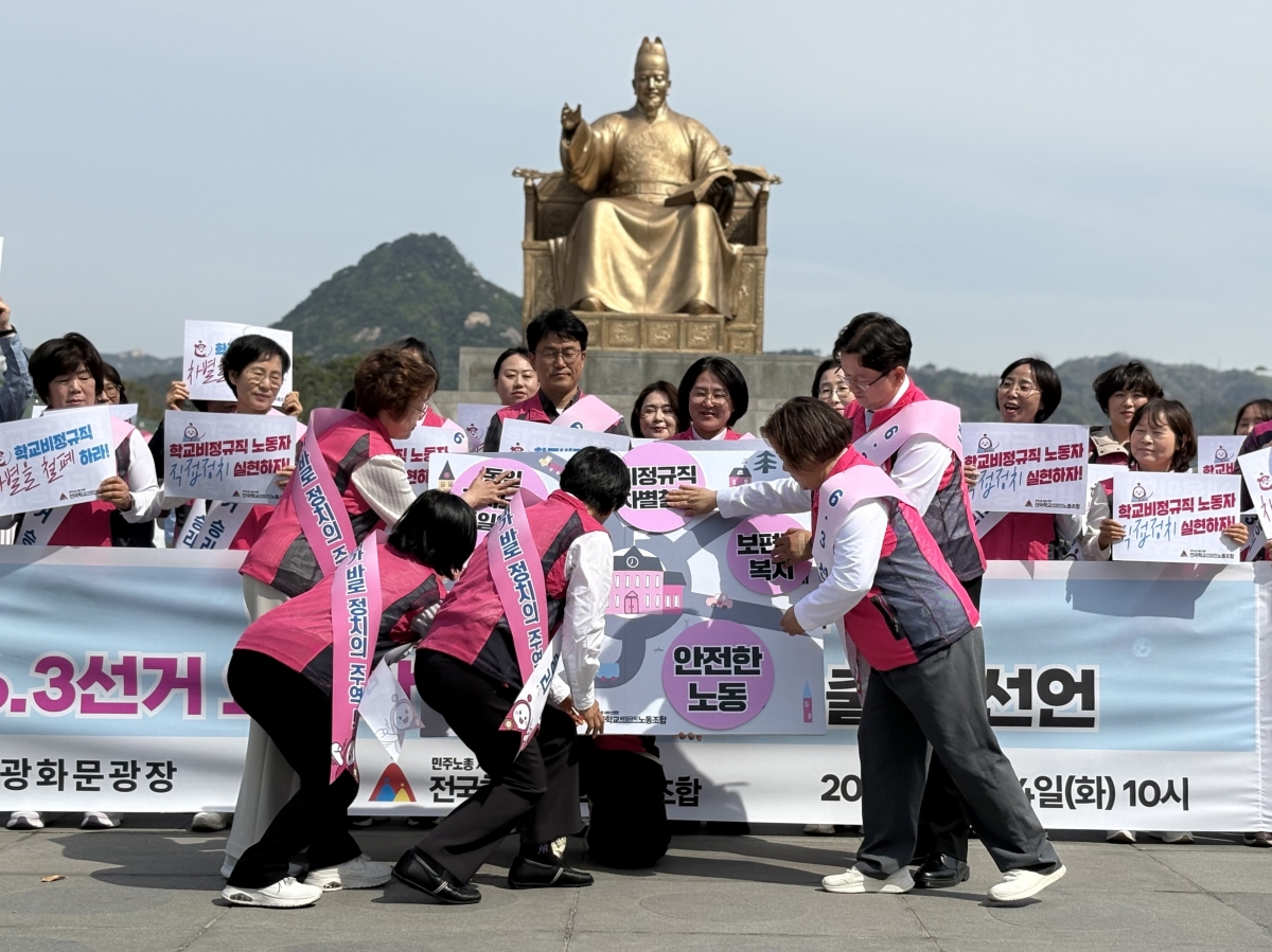 전국학교비정규직노동조합은 오늘(14일) 광화문 세종대왕 동상 앞에서 “학교비정규직 노동자 6.3선거 요구안 발표 및 47명 출마 선언 기자회견”을 진행했다.