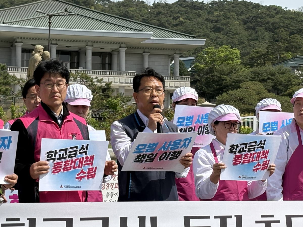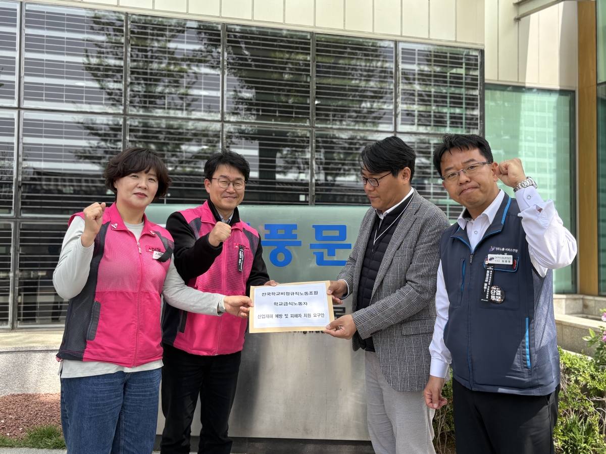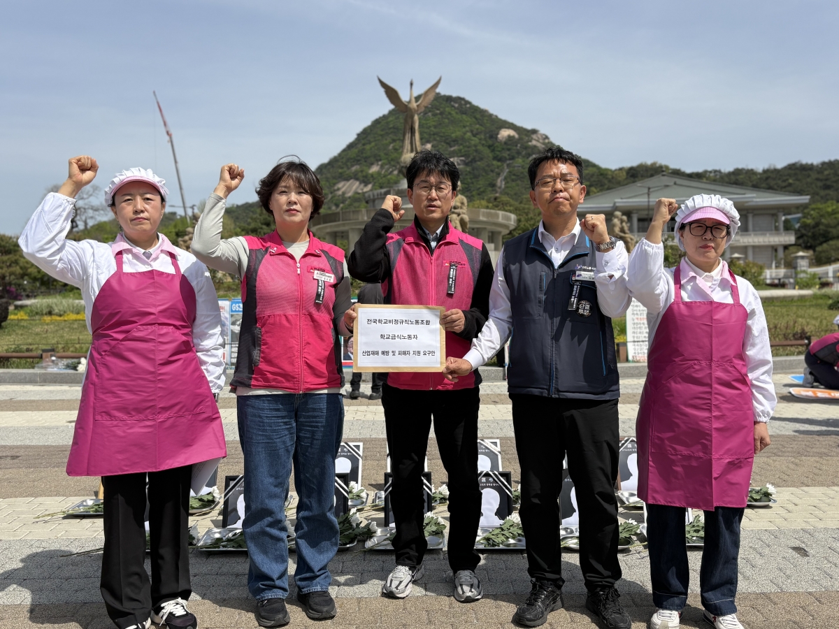 전국학교비정규직노동조합은 오늘(23일) 10시 30분 청와대 앞에서 “폐암 산재 사망 학교급식노동자 추모 및 교육부 학교급식종합대책 마련 촉구 기자회견”을 개최했다. 4.28 세계 산재 사망 노동자의 날을 맞아 폐암 산재 사망 학교급식 노동자 추모 및 산업재해 예방과 피해자 지원을 위한 정부의 신속한 대책 마련을 촉구하고자 개최된 기자회견이다. 기자회견 시작 전, 돌아가신 16명의 급식노동자들을 위한 헌화 및 묵념으로 추모의 시간을 가졌다. 기자회견 이후, 대통령비서관실 면담 및 요구안 전달을 진행했다. 우리의 요구는 ▲적정 식수인원 기준 연구용역 노동조합 참여 보장 ▲ 정기적 환기시설 개선 점검 및 지도 ▲폐암 산업재해 예방 및 피해자 지원▲학교급식종합대책 범정부 TF 구성 등이다. 전국학교비정규직노동조합은 일하다 죽지 않는 사회, 동료의 장례식에 가지 않아도 되는 사회를 만들기 위해 끝까지 투쟁할 것이다.