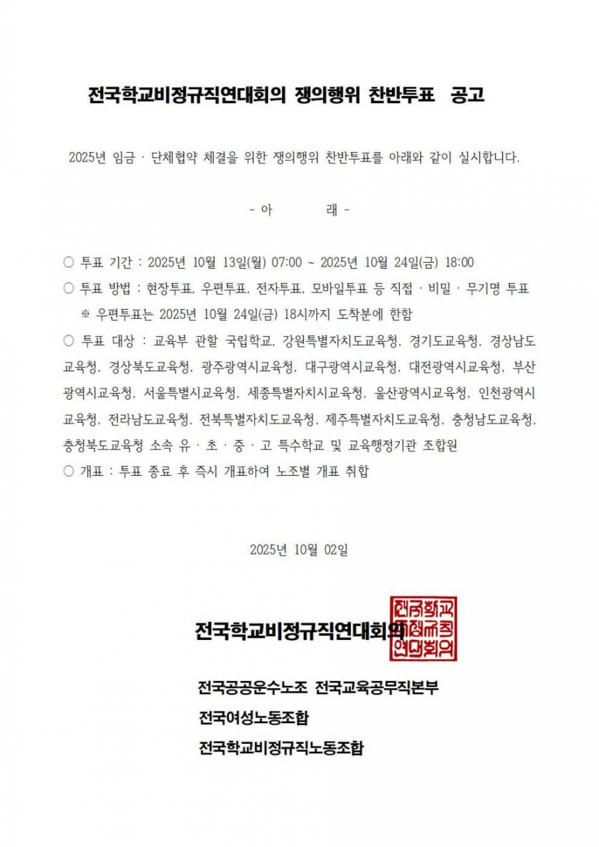 전국학교비정규직연대회의 쟁의행위 찬반투표 공고