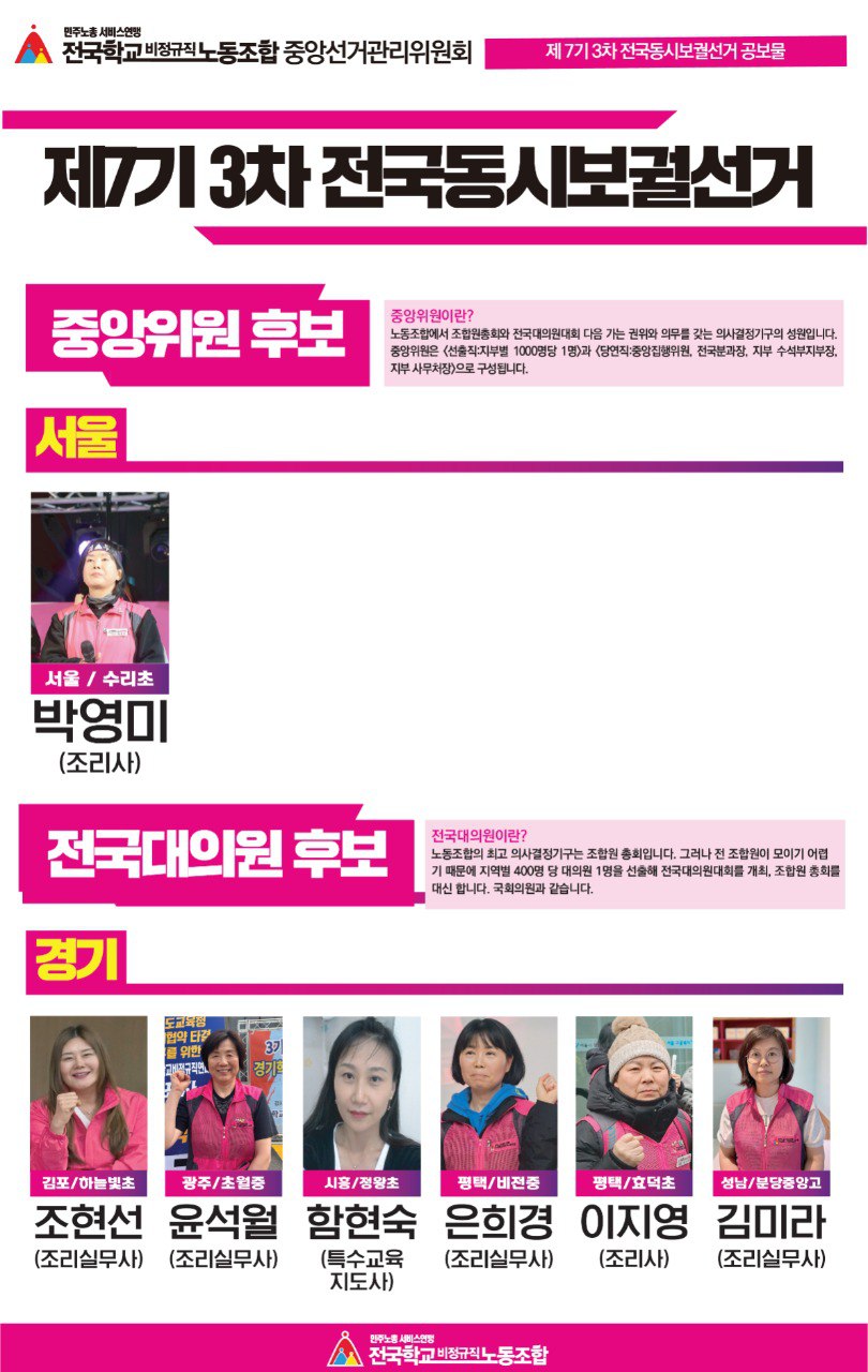 중요 전국학교비정규직노동조합 채용공고   전국학교비정규직노동조합 채용공고   2025. 11. 26.   1. 채용 기간 및 인원   구분 채용인원 담당업무 임금 근무기간 및 시간 전국학교비정규직노동조합 본조 약간명 채용 후 부서 배정 『교육공무직원 임금 지급 기준』에 따라 지급함 · 근무기간 : 2026.01.01~ · 수습기간 6개월(급여 100% 지급) · 근무시간 - 주5일(주40시간) 근무 - 09:00~18:00 (1일 8시간 근무, 휴게시간 포함) - 노동조합 특성상 주말 근무, 시간외 근무 있음 (시간외수당 내부규정에 따라 지급함)       2. 채용방법 : 1차 : 서류전형 2차 : 면접시험(1차 서류심사 통과자)   3. 응시자격 가. 아동·청소년의 성보호에 관한 법률 및 아동복지법에 의거 성범죄 및 아동학대 관련 범죄 사실이 없는 자 나. 학교근무 및 노동조합 경력자, 업무 관련 자격증 소지자 우대   4. 서류접수 및 전형일정 가. 접수 기간 및 시간 : 2025.11. 26 ~ 2025.12.15 18:00시까지 나. 접수 방법 : 우편 접수 또는 이메일 접수 다. 접 수 처 : 전국학교비정규직노동조합 총무국 (서울시 용산구 한강대로 329, 예안빌딩 6층),   - 이메일 주소 : kctuhakbi7@hanmail.net 라. 문의 : 전국학교비정규직노동조합 (02-847-2006, 010-8420-5246) 마. 제출 서류 : 1) 응시원서 1부(붙임1. 소정양식사용, 사진첨부 및 연락처 필히 기재)                2) 자기소개서(붙임2. 자유양식)                3) 주민등록등본 1부                4) 개인정보이용 동의서 1부(붙임3.) - 최종합격자 제출서류- 5) 경력증명서 각1부(해당자만-노동조합경력, 학교근무경력만 해당됨) 6) 자격증 사본 1부(관련 자격증에 한함, 해당자만) 바. 서류전형 합격자 : 합격자 유선 통보(불합격자 미통보) 사. 면접 일시 : 12월3주, 유선 통보(불합격자 미통보) 아. 최종합격자 : 유선 통보(불합격자 미통보)   5. 기타 가. 제출된 서류는 일체 반환하지 않으며 심사내용은 공개하지 않습니다. 나. 서류 미비 혹은 서류 기재사항이 사실과 다르면 심사대상에서 제외합니다. 다. 이력서 등 제출서류상의 기재착오 또는 누락이나 연락 불능 등으로 인한 불이익은 응시자의 책임입니다. 라. 서류 및 면접에서 채용예정자로 선정되었다 할지라도 신원조사, 범죄조회 결과 및 채용신체검사결과 채용부적격자는 합격이 취소됩니다. 마. 제출된 서류에 경력 또는 학력사항을 허위로 기재할 경우, 합격 취소 또는 계약을 해지할 수 있습니다.     2025. 11. 26. 전국학교비정규직노동조합