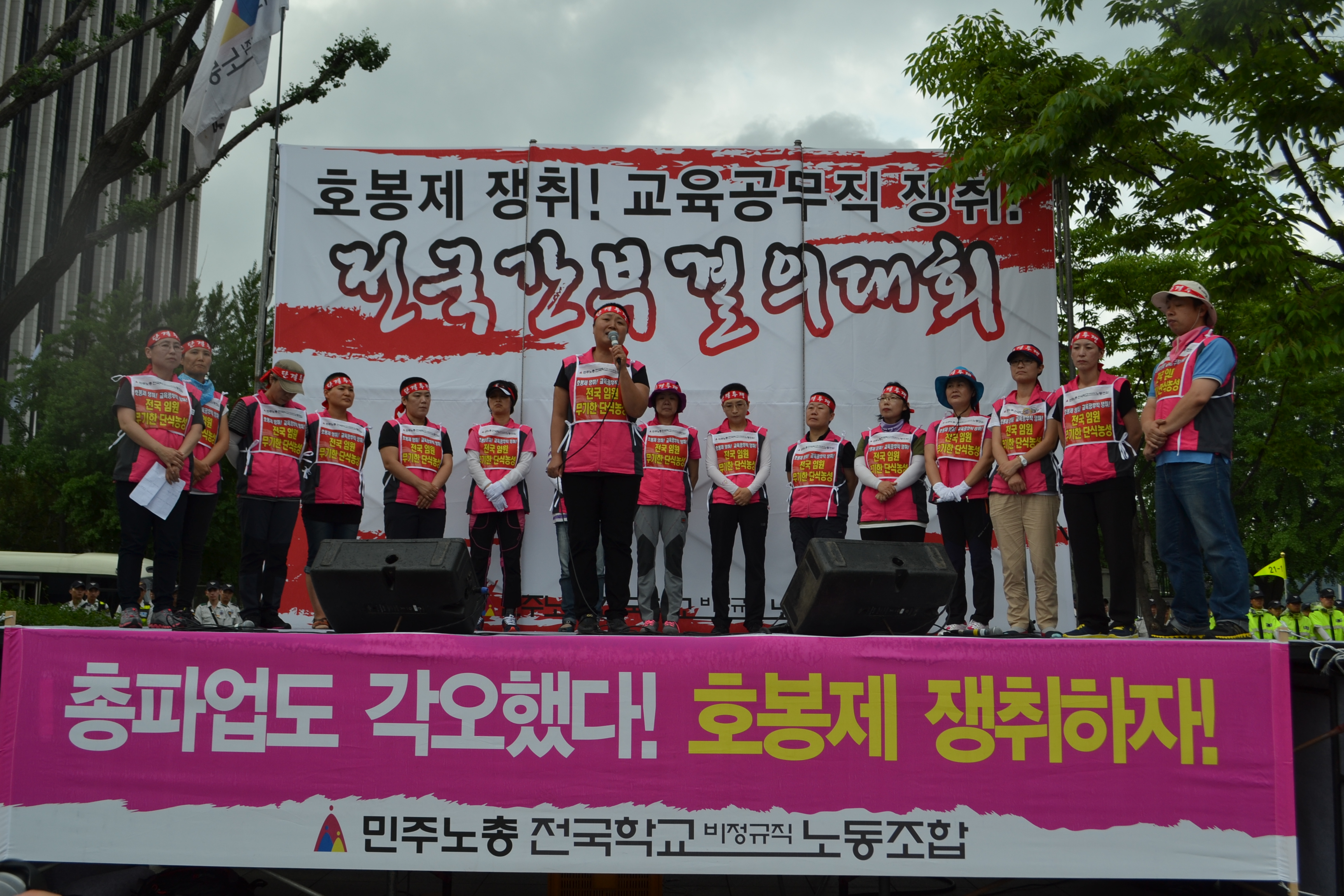 7월 26일 국회에서 교육부가 학교비정규직 관련 기본계획을 보고할것으로 예상되고 있기에 우리는 교육부에 실질적인 처우개선안을 내라고 압박하고 그렇지않을시 9월 총파업까지 불사한다는 학교비정규직의 굳은 결의를 대내외에 선포한 것입니다.