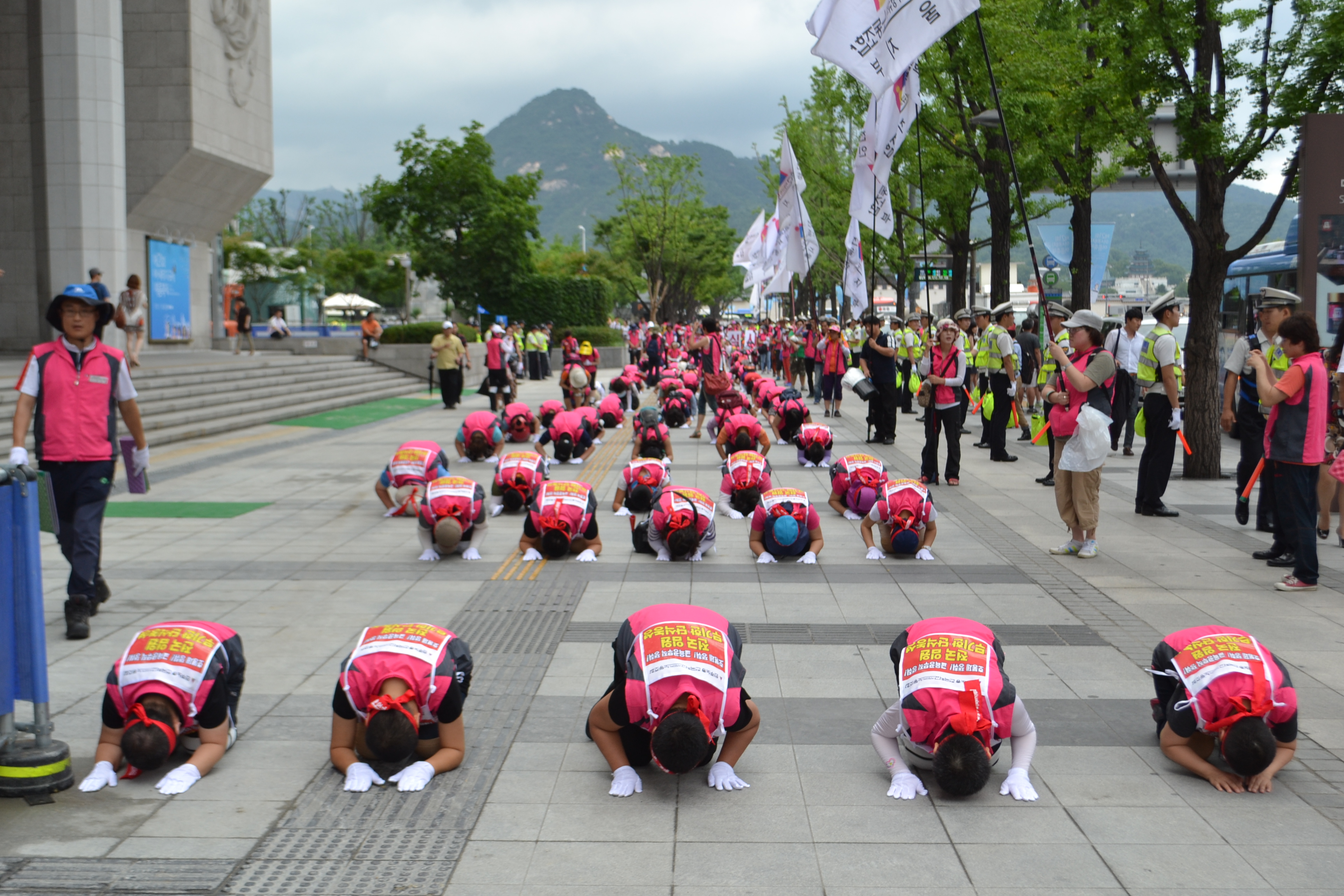 비가 흩뿌리다 개는 날씨에도 모든 참가자들의 절절한 염원과 의지로 5보 1배가 진행됐습니다. 역사상 첫 교육부 정문 노숙농성진행에 이어 역사상 첫 세종로 공원 내 노동자집회, 사상 최초로 500여 의 학교비정규직노동자들의 서울곳곳 5보1배 투쟁을 진행한 것입니다. 전국학교비정규직이 가는 길은 언제나 역사상 최초입니다. 그만큼 사명을 가지고 투쟁하고 있습니다.