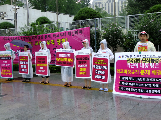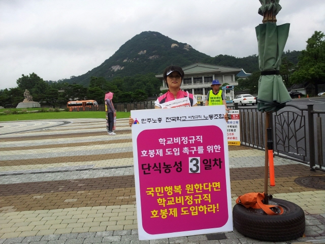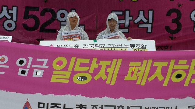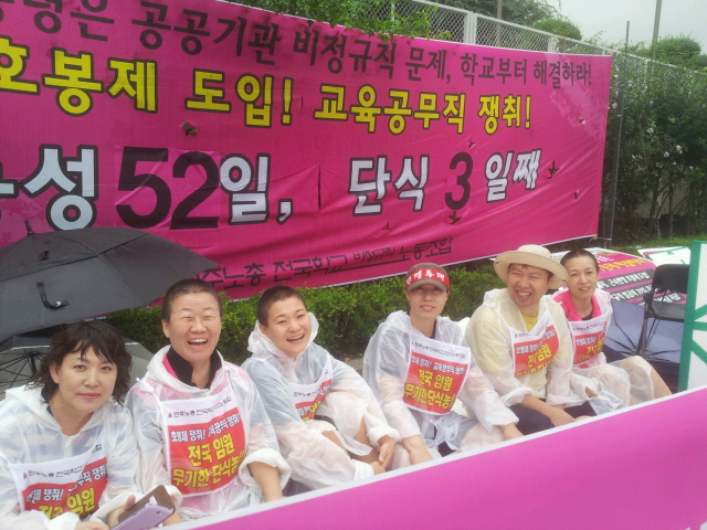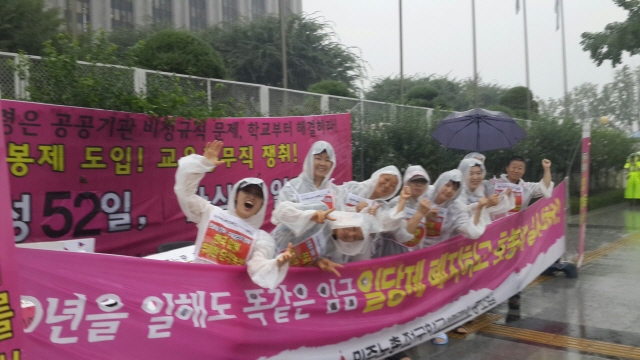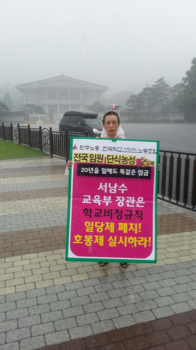7월 22일(월) 호봉제 도입 촉구! 전국임원 단식농성 3일차 출근선전전, 비가 징글징글하게도 쏟아집니다.