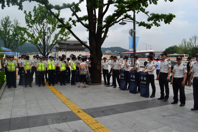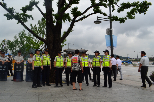 한걸음도 못나가게 발을 꽁꽁 묶어버리고 철저히 가린 경찰들!