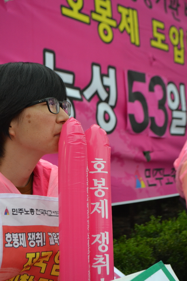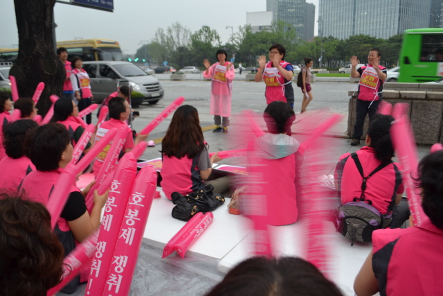 조병훈 경기지부 사무국장의 선창에 맞춰 "호봉제를 도입하라!" 힘차게 구호를 외치는 참가자들