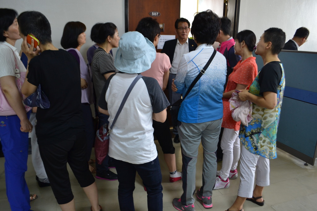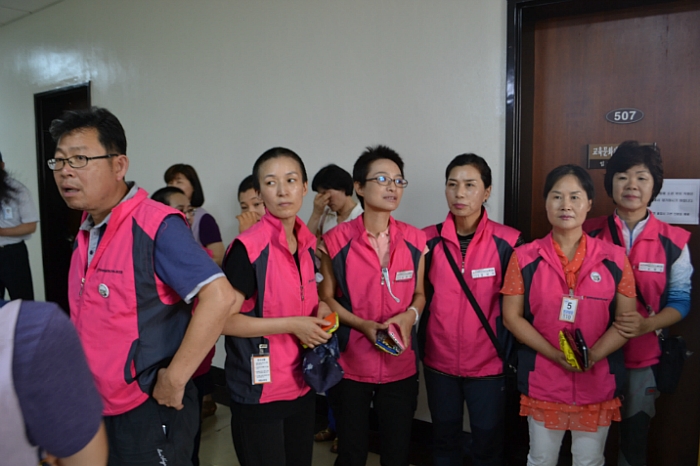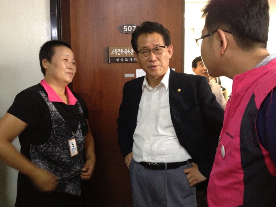 노동조합이 왔다는 소식을 듣고 마중나온 유기홍 의원과 대화중인 모습