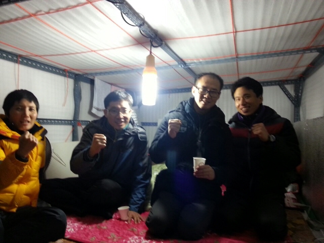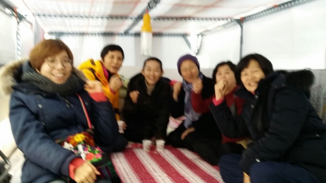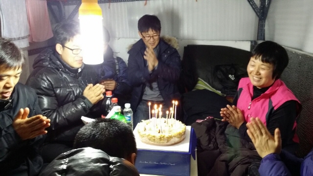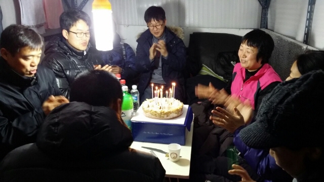 농성장에서 생일을 맞은 박금자 위원장을 위해 조촐한 생일파티를 열었습니다.