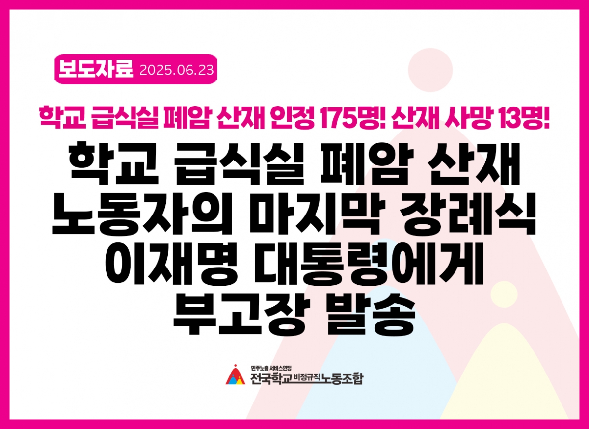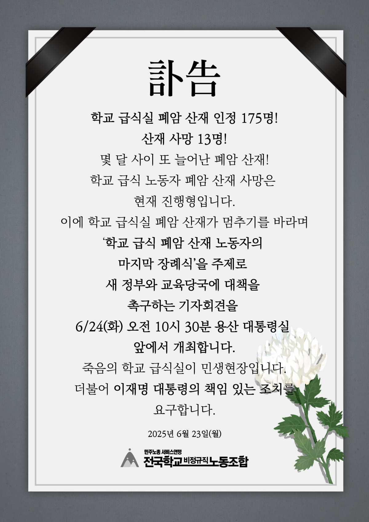 • 이에 전국학교비정규직노동조합(위원장 민태호, 아래 학비노조)은 학교 급식실 폐암 산재가 멈추기를 바라며 학교 급식 폐암 산재 노동자의 마지막 장례식을 주제로 새 정부와 교육당국에 대책을 촉구하는 기자회견을 내일 6/24() 오전 1030분 용산 대통령실 앞에서 개최합니다. 그리고 기자회견 전날인 오늘(23) 학교 급식실 폐암 산재 노동자의 마지막 장례식의 부고장을 이재명 대통령에게 온라인으로 발송하였습니다.
