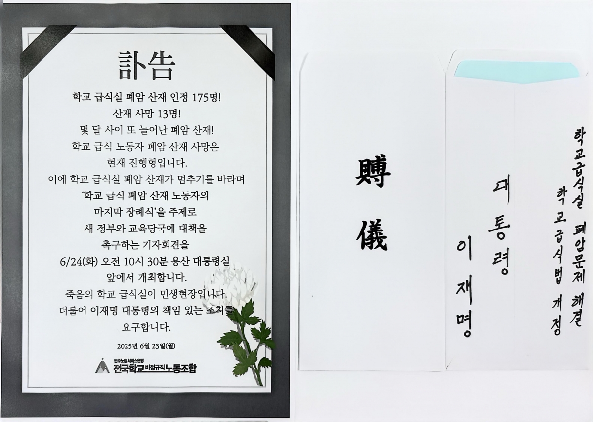 '학교 급식실 폐암 산재 노동자의 마지막 장례식' 이재명 대통령에게 부고장 발송