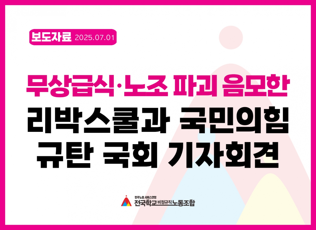 전국학교비정규직노동조합은 오늘 오전 10시 20분, 국회 소통관에서 무상급식·노조 파괴 음모한 리박스쿨과 국민의힘 규탄 국회 기자회견을 진행하였습니다.