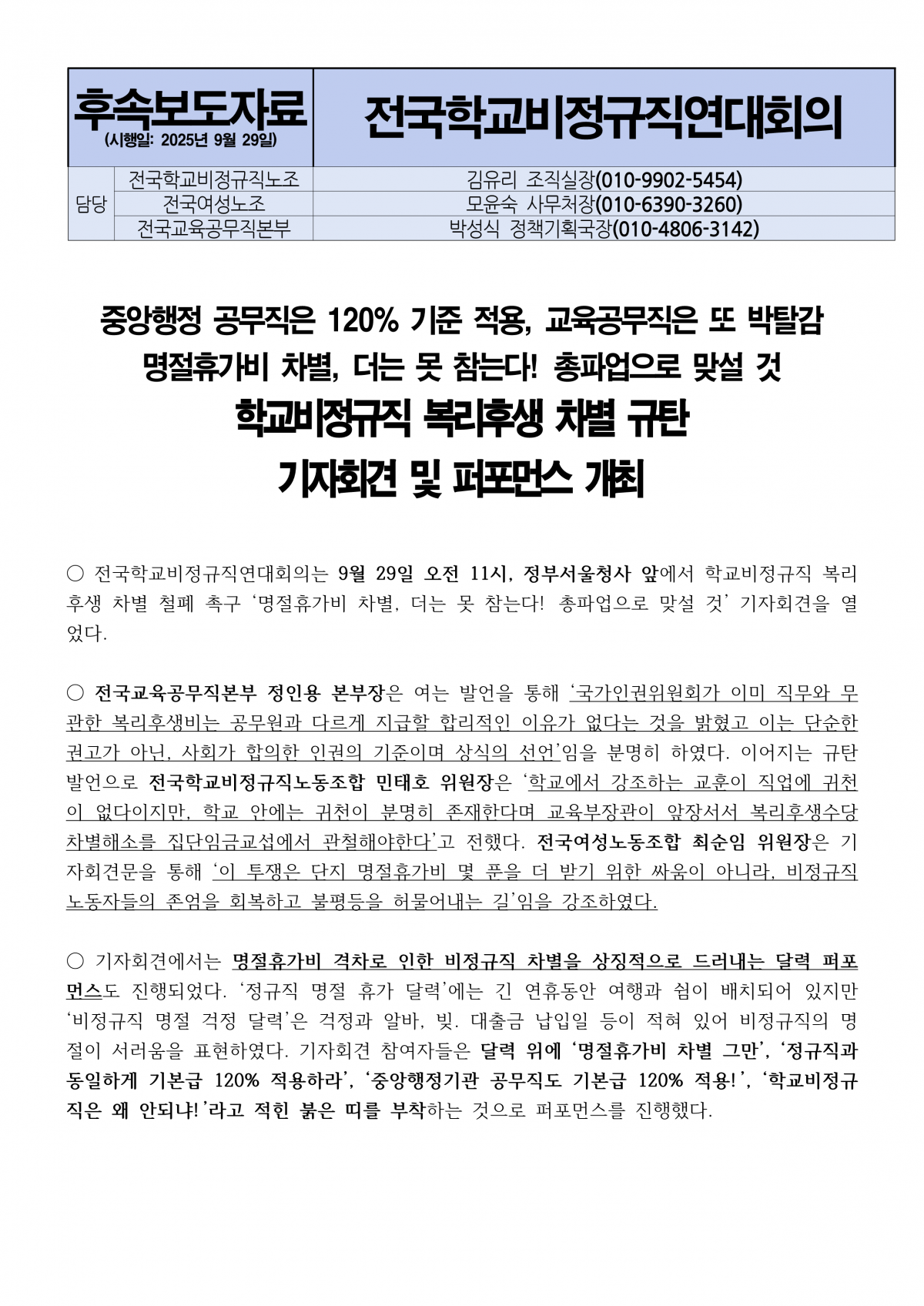 후속보도자료_20250929_학교비정규직_복리후생_차별철폐_촉구_기자회견_Final.hwp