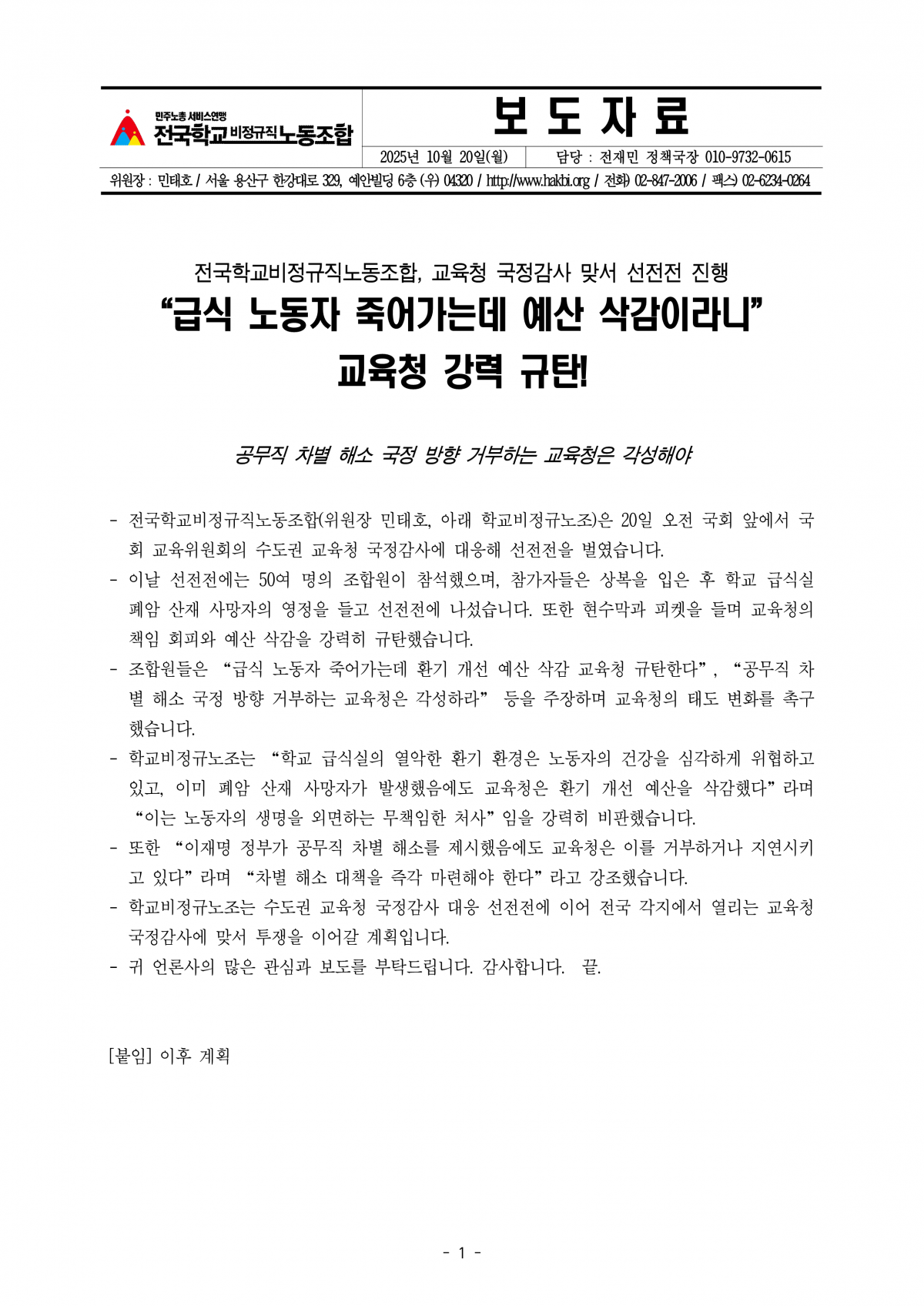 [보도자료] 급식 노동자 죽어가는데 예산 삭감이라니 교육청 강력 규탄(251020).pdf