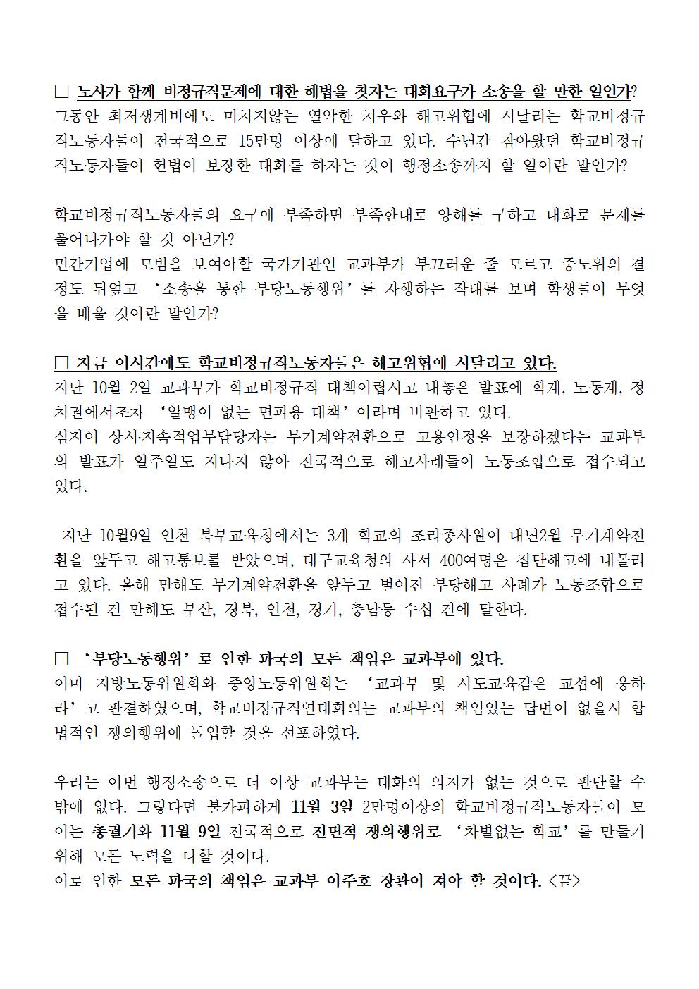 [논평] 10월2일 교육과학기술부의 학교비정규직처우개선 보도자료에 대한 논평