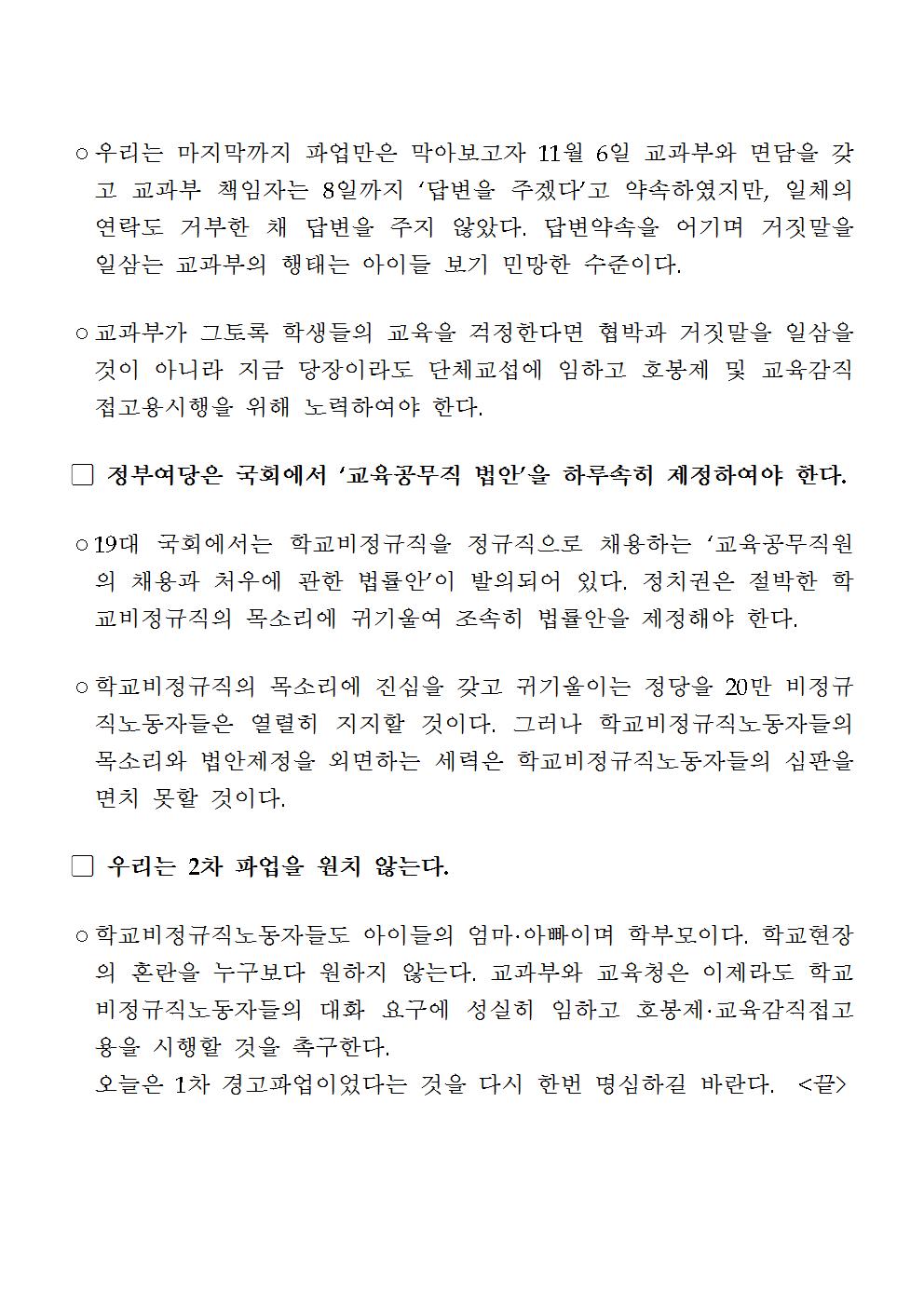 [전교조 성명서]정부는 학교비정규직 노동자들의 절실한 요구를 즉각 수용하라