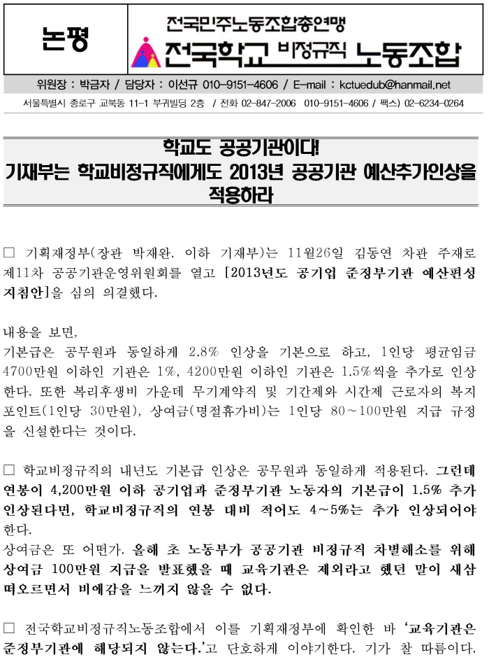 [논평] 기재부는 학교비정규직에도 2013년 공공기관 예산추가인상을 적용하라!