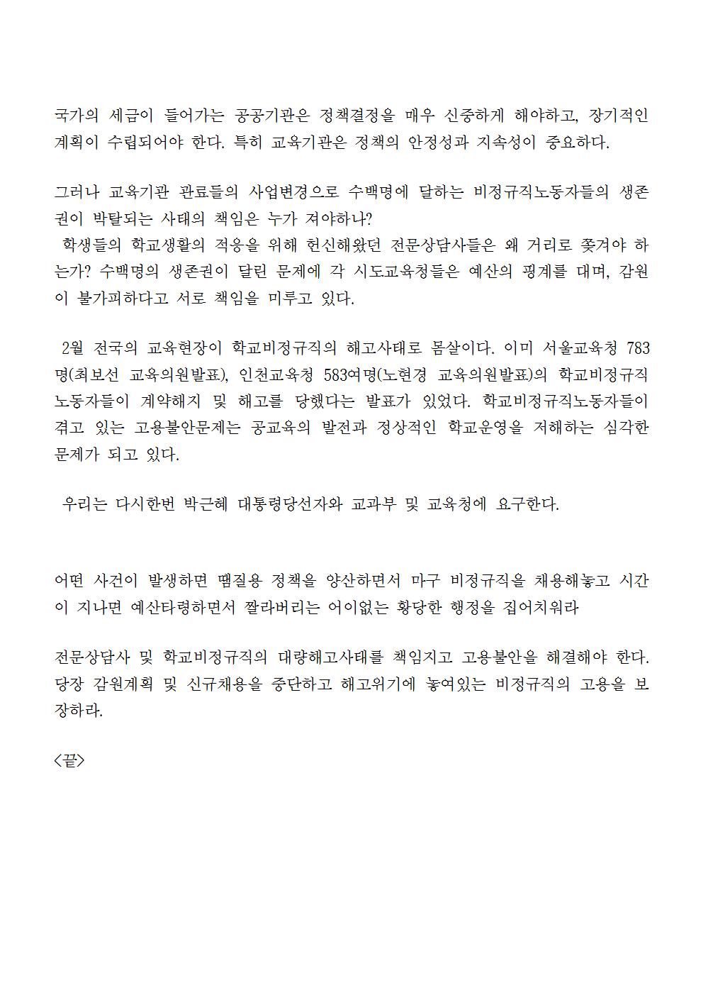 [긴급성명] 학교비정규직 1만명 대량해고 규탄