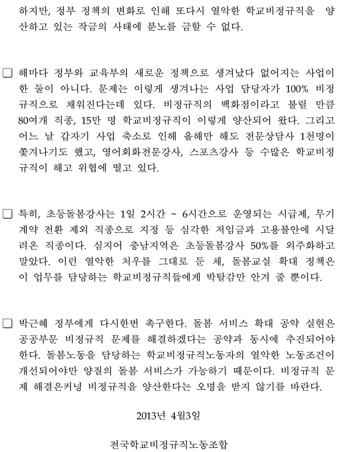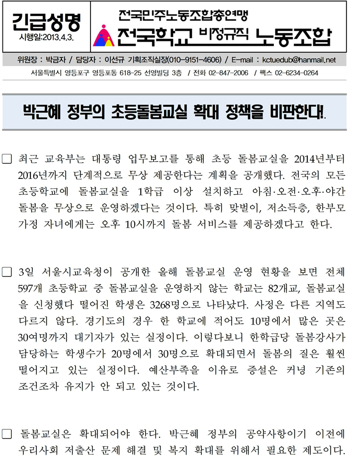 [긴급성명]박근혜정부 초등돌봄교실 확대 정책을 비판한다!(20130403)