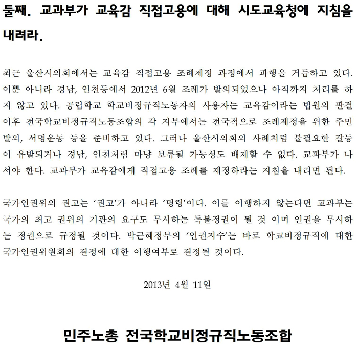 [학비노조 인천] 교육감직접고용 시행하라! 국가인권위 결정에 부쳐