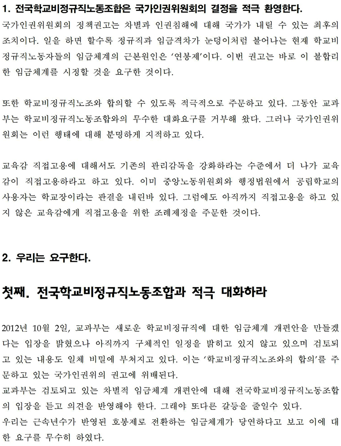 [논평]국가인권위원회의 ‘학교비정규직 차별과 고용관계 개선’ 정책권고 의결 환영한다