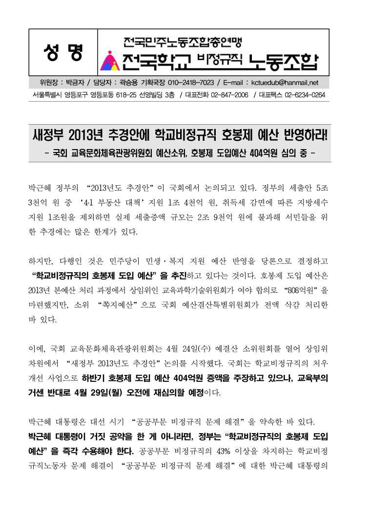 [성명] 새정부 추경안, 학교비정규직 호봉제 예산 심의 중!