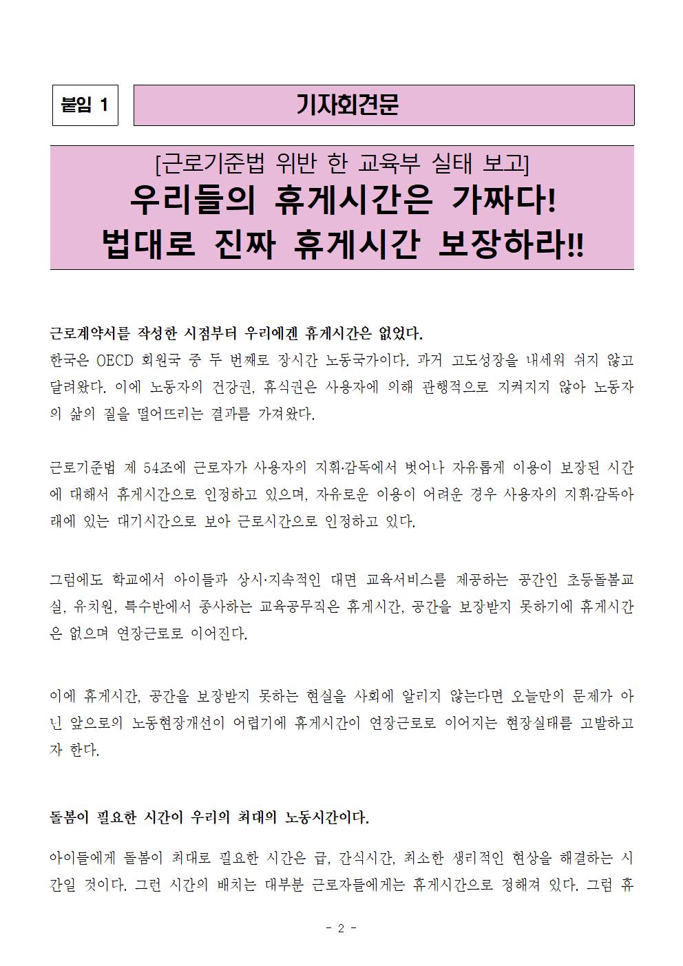 (180725보도자료)근로기준법 위반 한 교육부 실태보고_우리들의 휴게시간은 가짜다! 법대로 진짜 휴게시간 보장하라!.hwp
