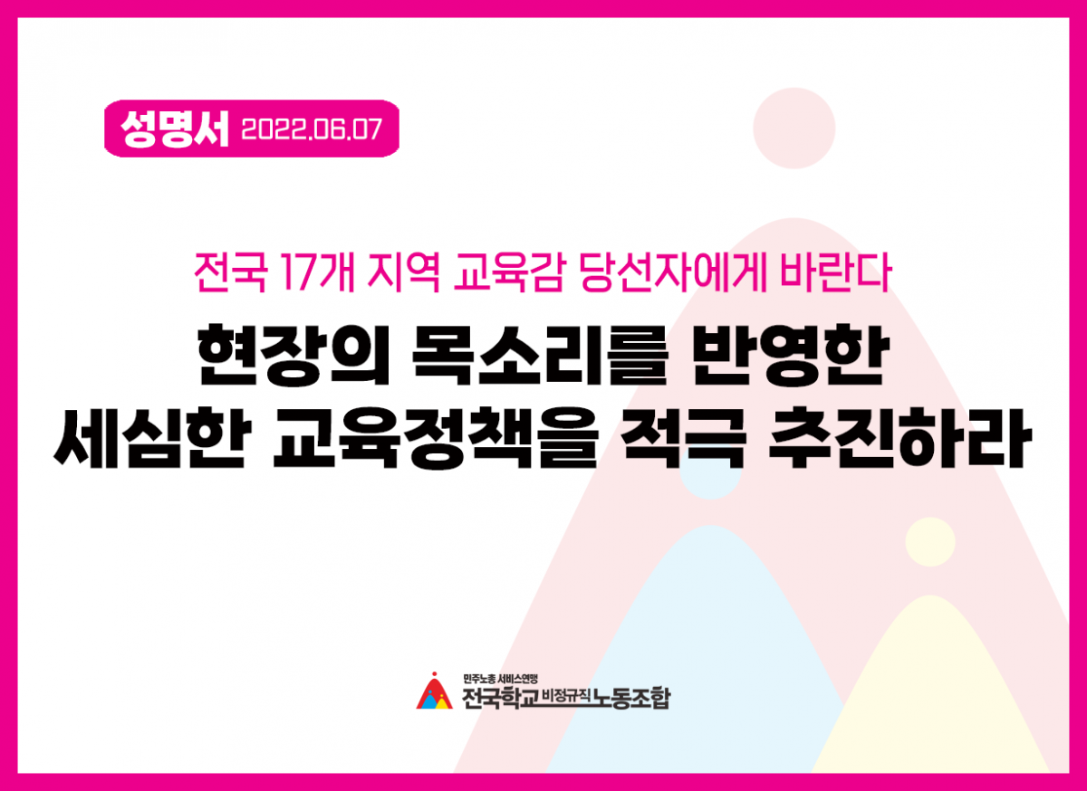 2022년 하반기 새 교육감들의 첫 번째 학교노사관계 시험대는 학교비정규직연대회의와의 집단임금교섭이 될 것이다. 전국학교비정규직노동조합은 올해 6년차 집단교섭을 안정적으로 진행하기를 바란다. 약 20만여 명의 교육공무직과 비정규직 강사의 근로조건을 결정하는 집단임금교섭에 교육감이 직접 교섭 대표로 나와 전국적으로 단일한 학교비정규직 임금체계 개편 로드맵을 합의하면 향후 4년 임기는 평화적 노사관계를 유지할 것이다.