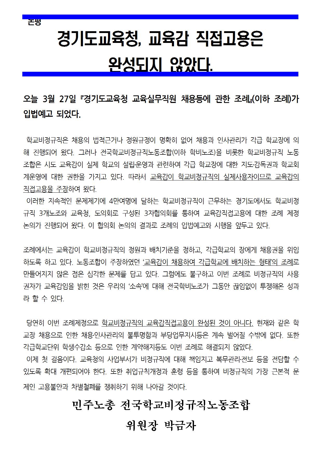 교육감직접고용은 완성되지 않았다.-<경기도교육청 교육실무직원 채용등에 관한 조례>논평