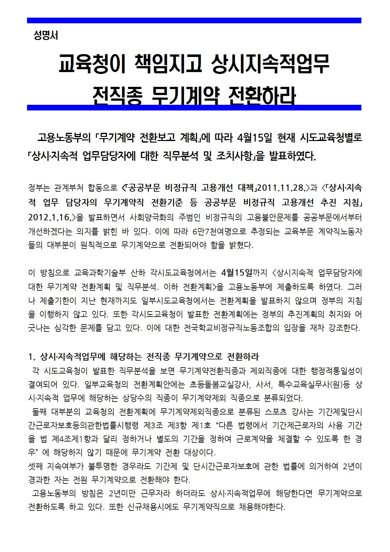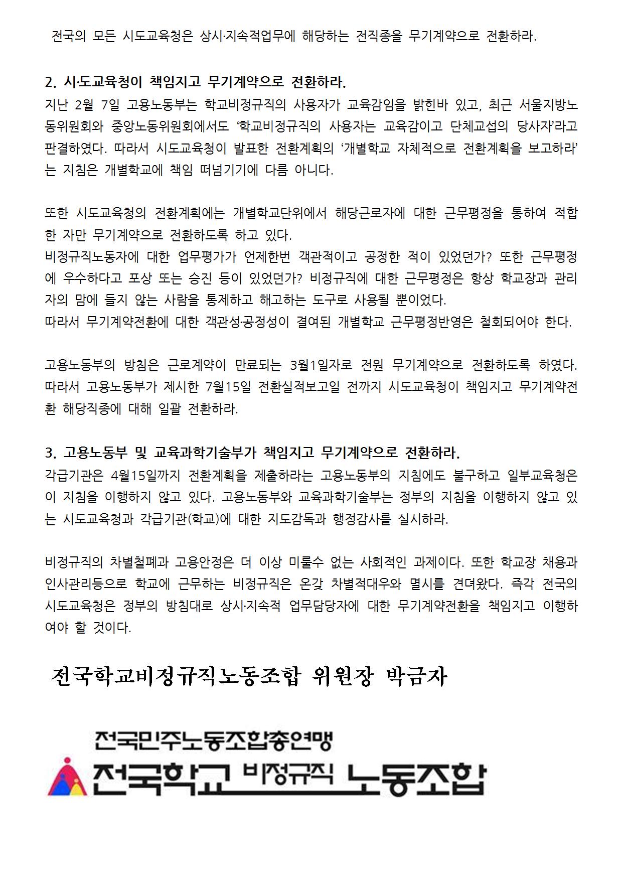 교육청이 책임지고 상시지속적업무 전직종 무기계약으로 전환하라